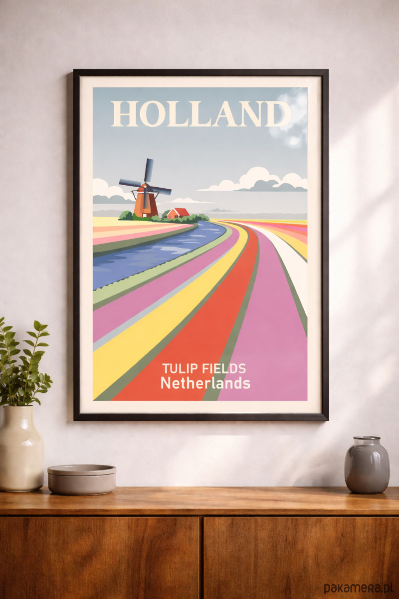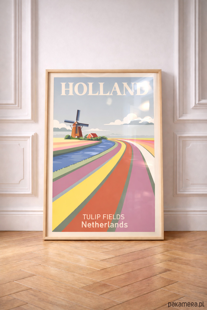 Subtelna kompozycja inspirowana pejzażem holenderskich pól tulipanów zamknięta w wyważonej, graficznej formie. Miękka paleta i płynna perspektywa prowadzą wzrok w głąb obrazu, budując spokój i lekkość przestrzeni. To plakat który nie krzyczy kolorem lecz świadomie go komponuje tworząc elegancki akcent. W zestawieniu z naturalnym światłem i delikatnym odbiciem w szkle nabiera galeryjnej jakości i wprowadza do wnętrza atmosferę dopracowanej prostoty.