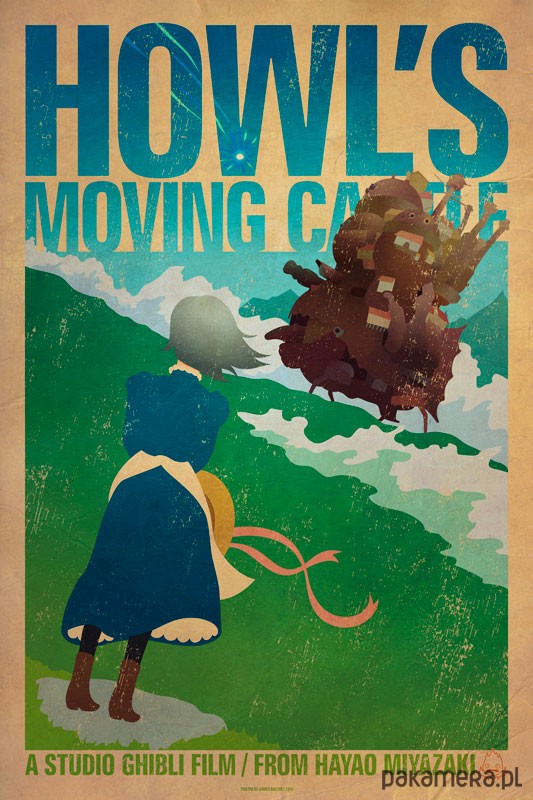 Plakat z autorską grafiką inspirowaną filmem Howl's Moving Castle (Ruchomy zamek Hauru) w reżyserii Hayao Miyazakiego.