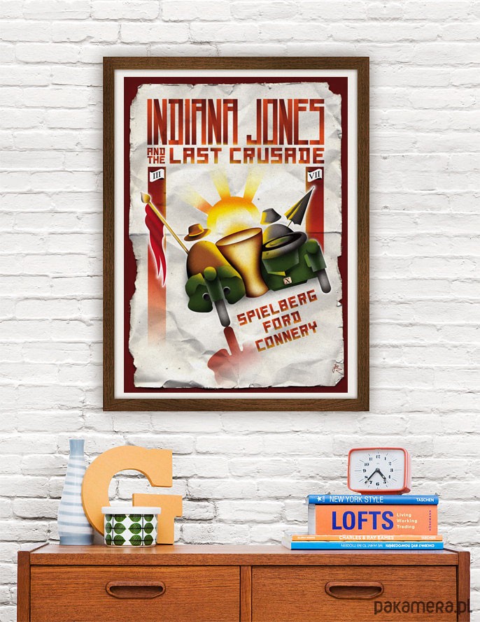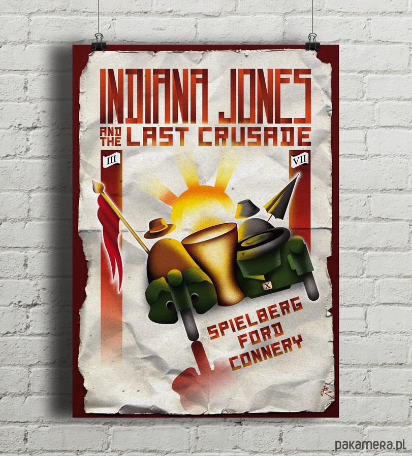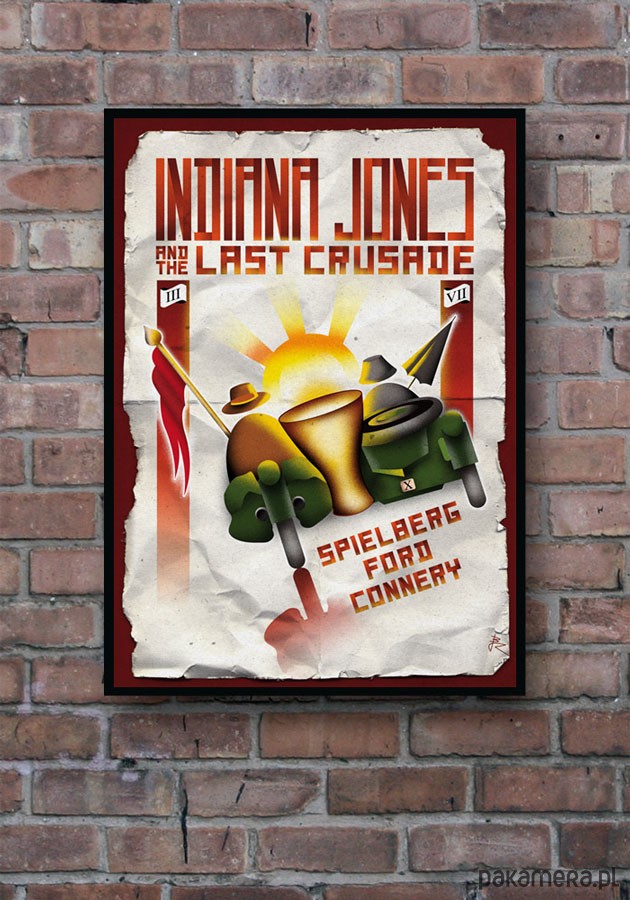Plakat z autorską grafiką inspirowaną filmem Indiana Jones i Ostatnia Krucjata (Indiana Jones and the Last Crusade) w reżyserii Stevena Spielberga.