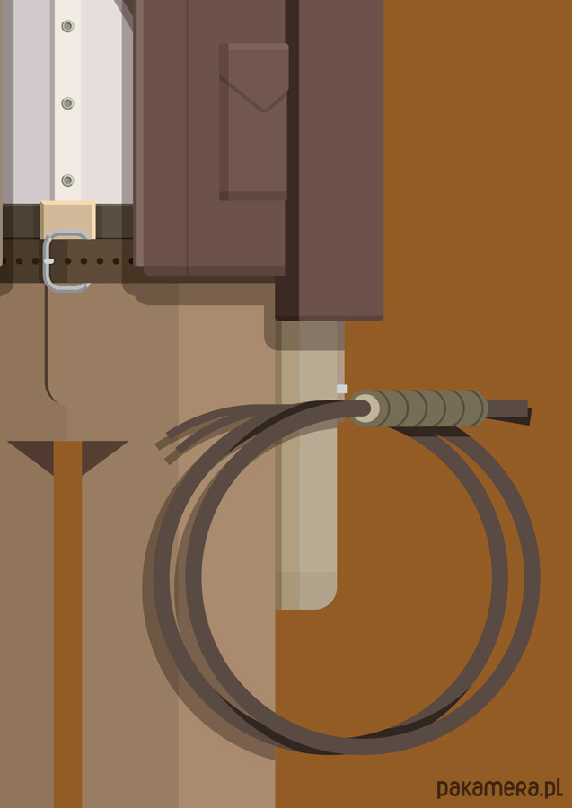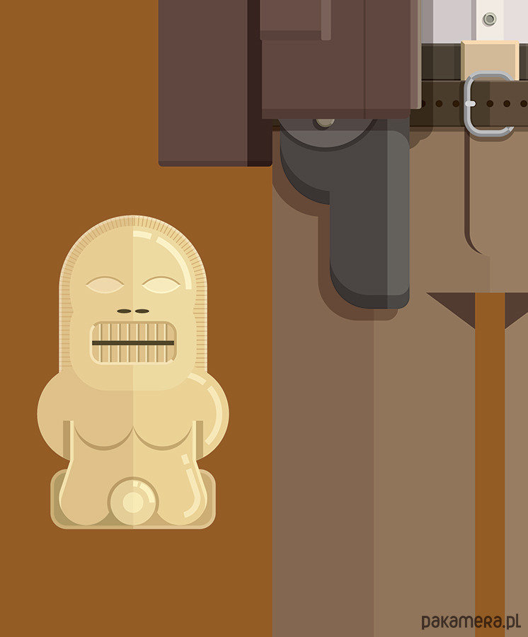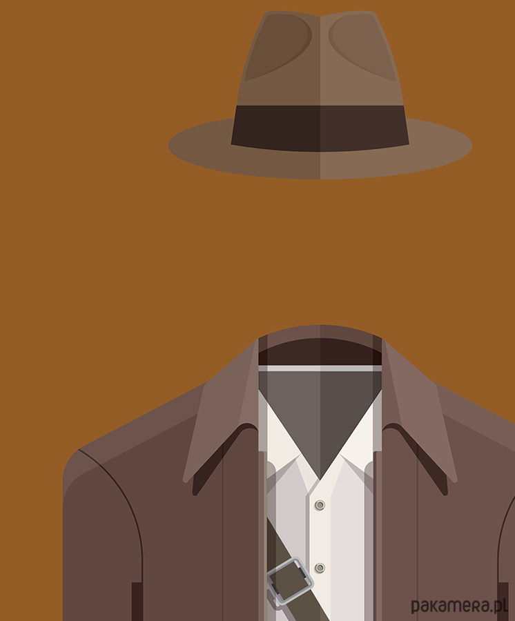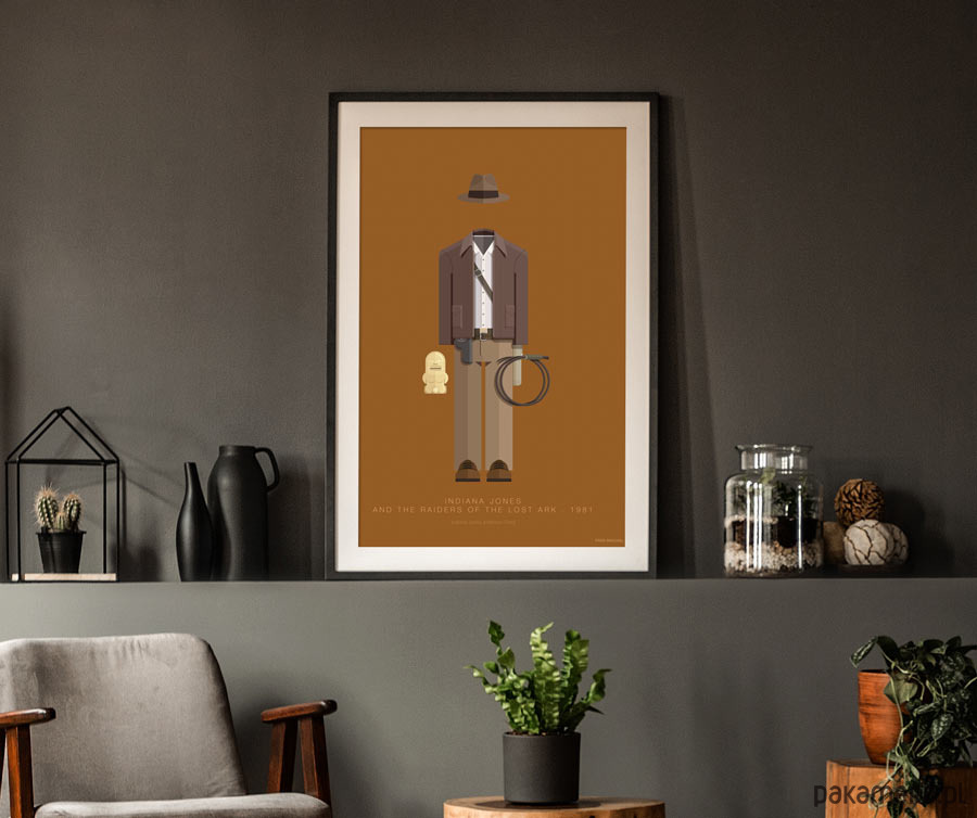 Plakat z autorską grafiką inspirowaną filmem "Poszukiwacze Zaginionej Arki" (Raiders Of The Lost Ark), reż. Steven Spielberg. Pochodzi z serii "Hollywood Costumes" i przedstawia strój Indiany Jonesa.