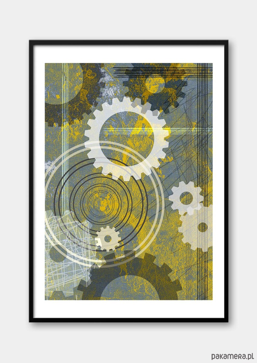 Kompozycja opiera się na geometrycznych kształtach przypominających koła zębate i mechanizmy, zestawionych z fakturami oraz dynamicznymi liniami.