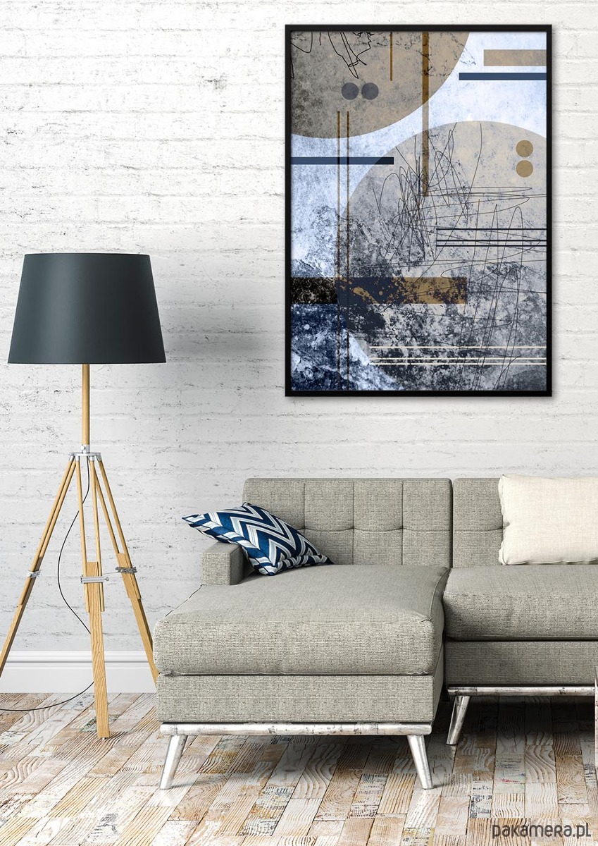 Subtelna paleta barw – odcienie błękitu, beżu i grafitu – sprawia, że obraz doskonale odnajdzie się w wnętrzach:
