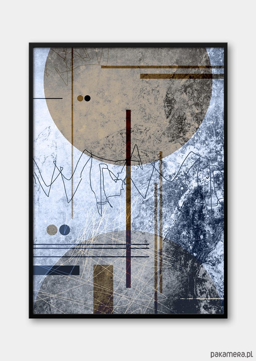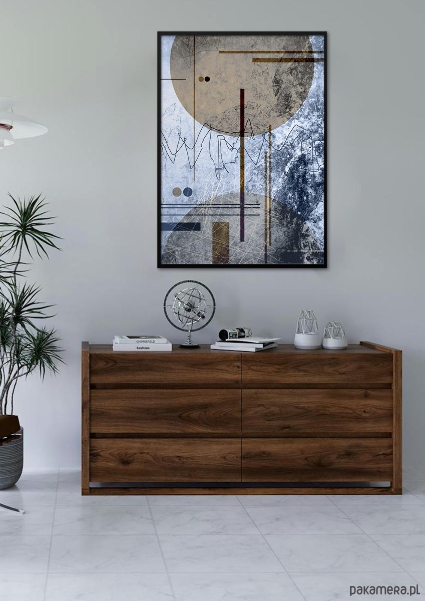 Delikatnie nakładające się na siebie okręgi, pionowe akcenty i dynamiczne kreski budują harmonijny dialog pomiędzy porządkiem a chaosem, co czyni dzieło idealnym wyborem dla osób ceniących nowoczesny design, industrialne wnętrza i sztukę współczesną o wyraźnym charakterze.