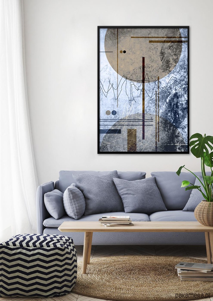 Subtelna paleta barw – odcienie błękitu, beżu i grafitu – sprawia, że obraz doskonale odnajdzie się w wnętrzach: