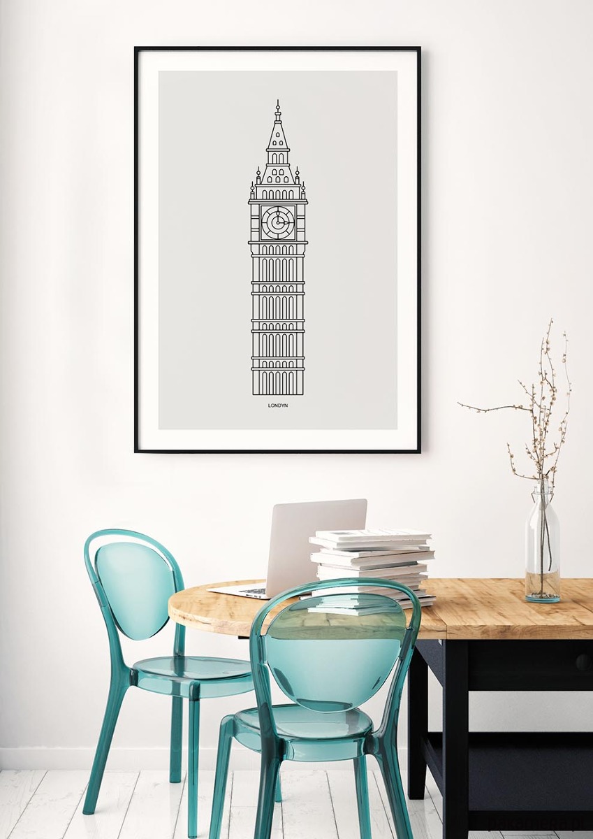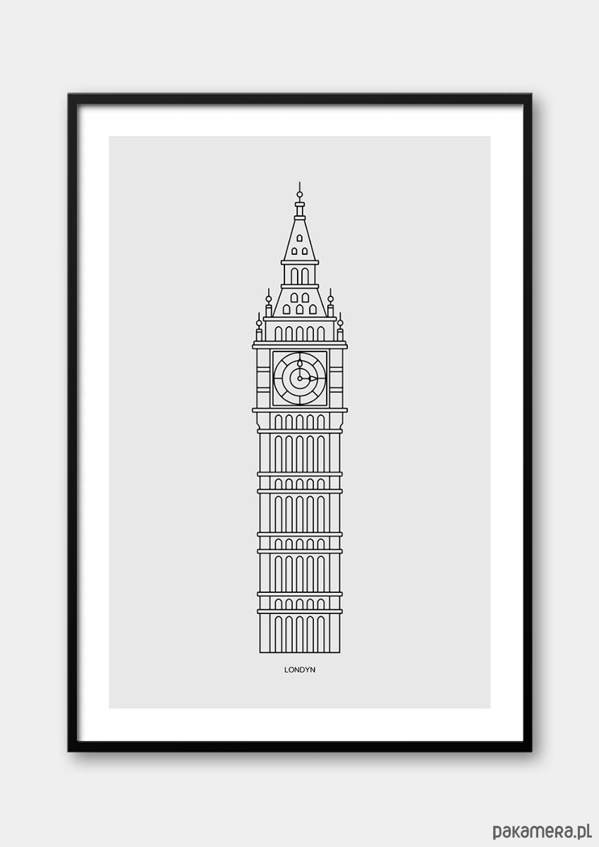 Ta minimalistyczna grafika przedstawia ikoniczną londyńską wieżę zegarową w eleganckiej, linearnej formie. Precyzyjnie poprowadzona kreska tworzy charakterystyczną sylwetę Big Bena, podkreślając jego geometryczne detale oraz monumentalną architekturę. Styl line art dodaje lekkości oraz nowoczesnej harmonii, dzięki czemu motyw staje się ponadczasowy i idealnie wpisuje się w estetykę współczesnych wnętrz szczególnie w stylu: