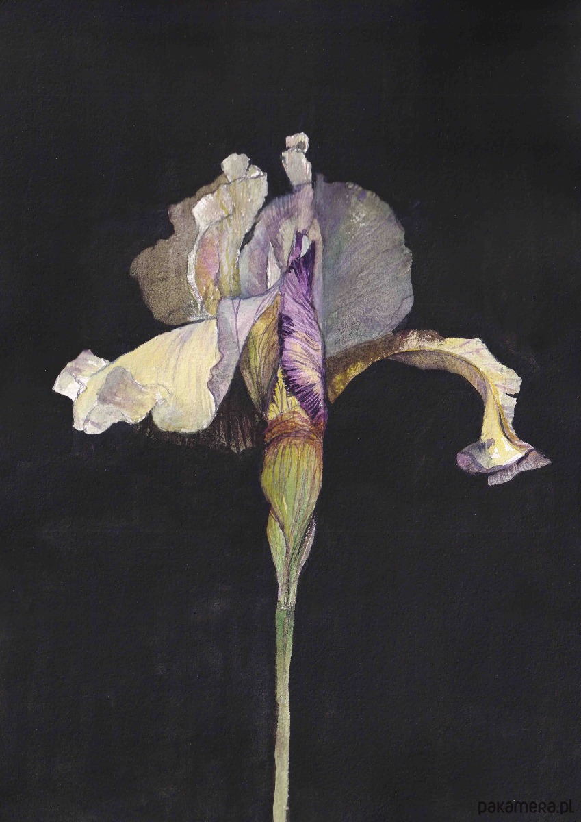Zdigitalizowana akwarela ilustrująca kwiat Irysa zaczynająca cykl z kwiatami opowiadający o kobiecości.