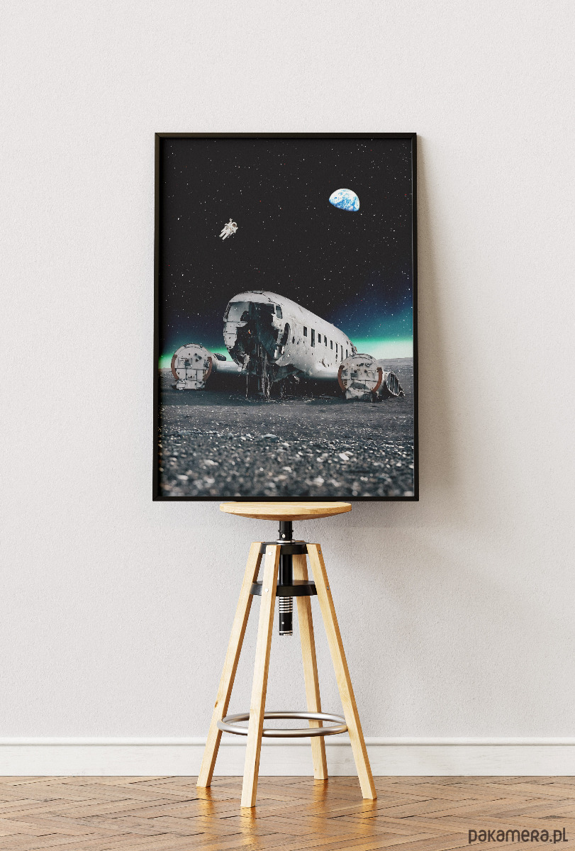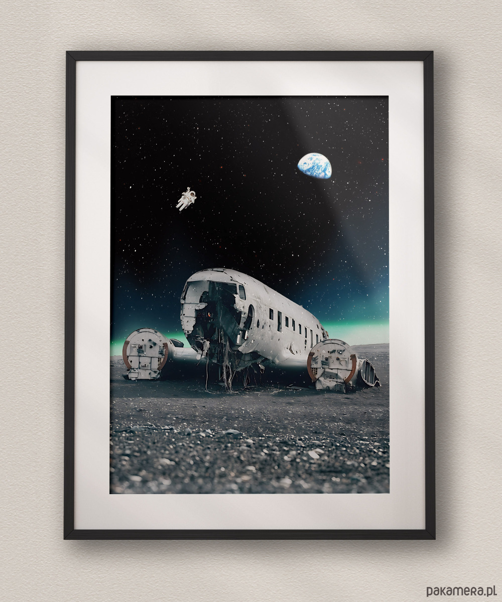 Ten projekt to surrealistyczne spojrzenie na jeden z najbardziej znanych wraków świata – amerykański samolot transportowy Douglas Super DC-3 (C-117), który w 1973 roku przymusowo lądował na czarnej plaży Sólheimasandur. Na plakacie surowy, islandzki krajobraz zmienia się w obcą planetę. Kadłub maszyny, od dekad smagany arktycznym wiatrem, wygląda tu jak porzucony wrak statku kosmicznego, nad którym góruje nieskończona pustka wszechświata.