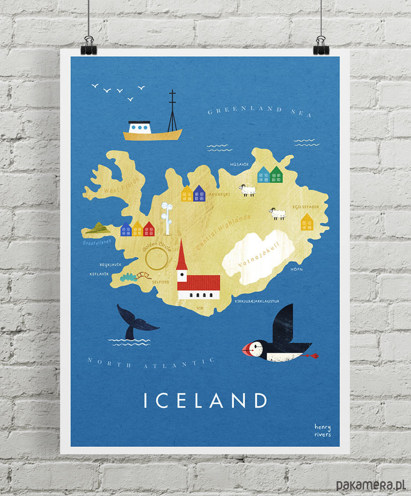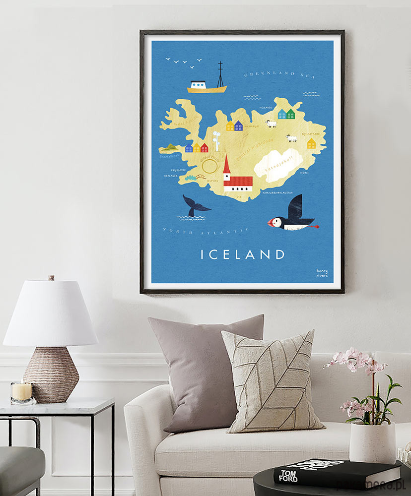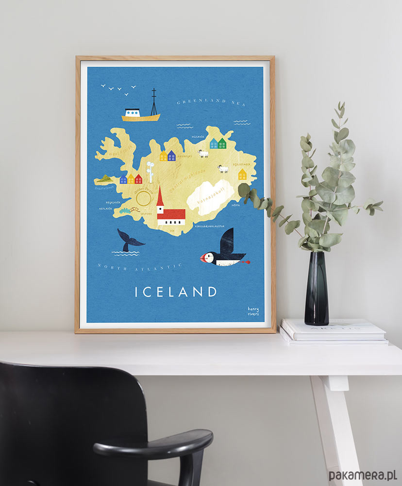 Plakat Islandia - mapa graficzna z wielorybami, pięknymi maskonurami, kolorowymi domkami i niesamowitymi gejzerami. Wszystkie te punkty zaznaczone zostały na naszym plakacie - mapie z obrysem tej niezwykłej wyspy. Plakat świetnie sprawdzi się w pokoju każdego podróżnika, niezależnie od wieku.