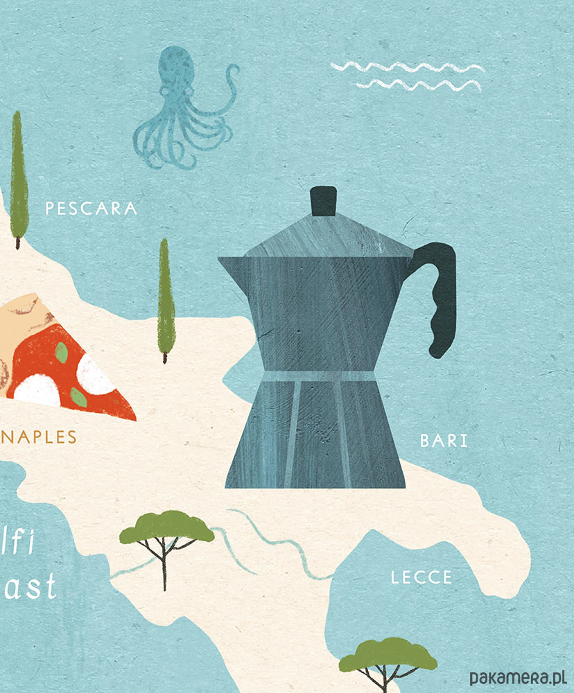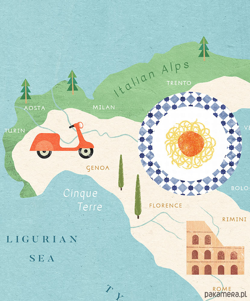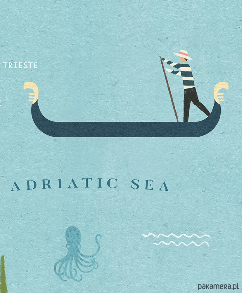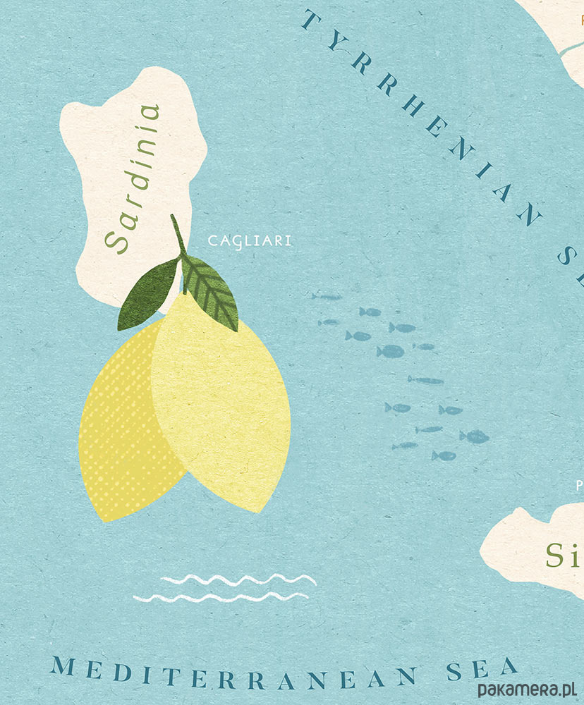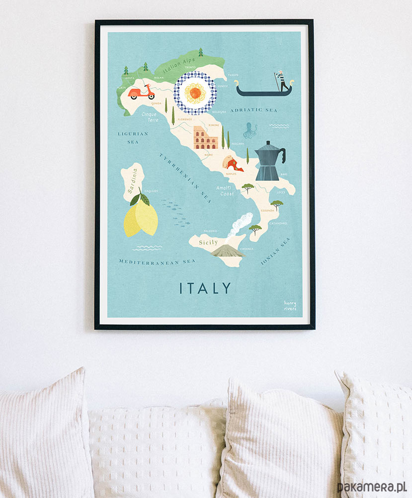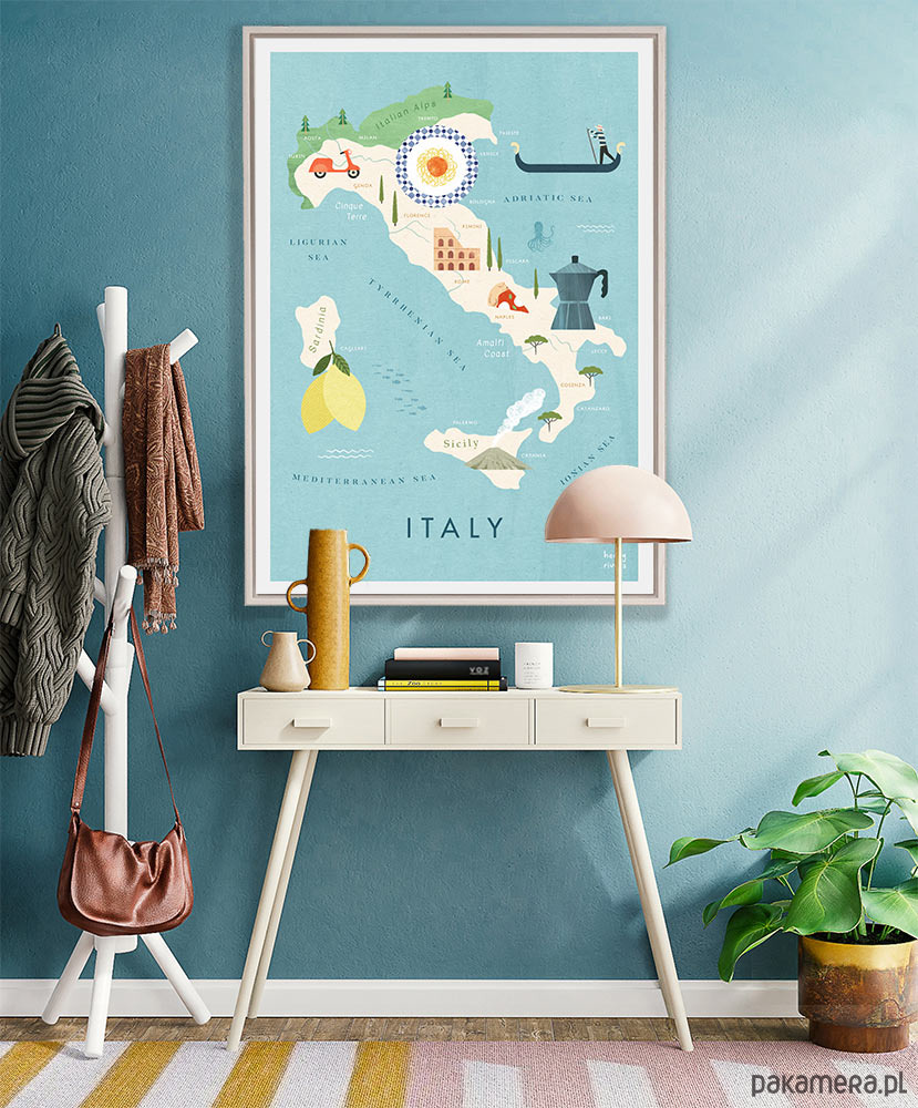 Plakat podróżniczy przedstawiający mapę Włoch, z uroczymi klasykami dopasowanymi do odpowiednich rejonów. Gondole, kultowy skuter Vespa, spaghetti, Koloseum, genialna kawa i oczywiście cytrynowe szaleństwo na Sardynii.
