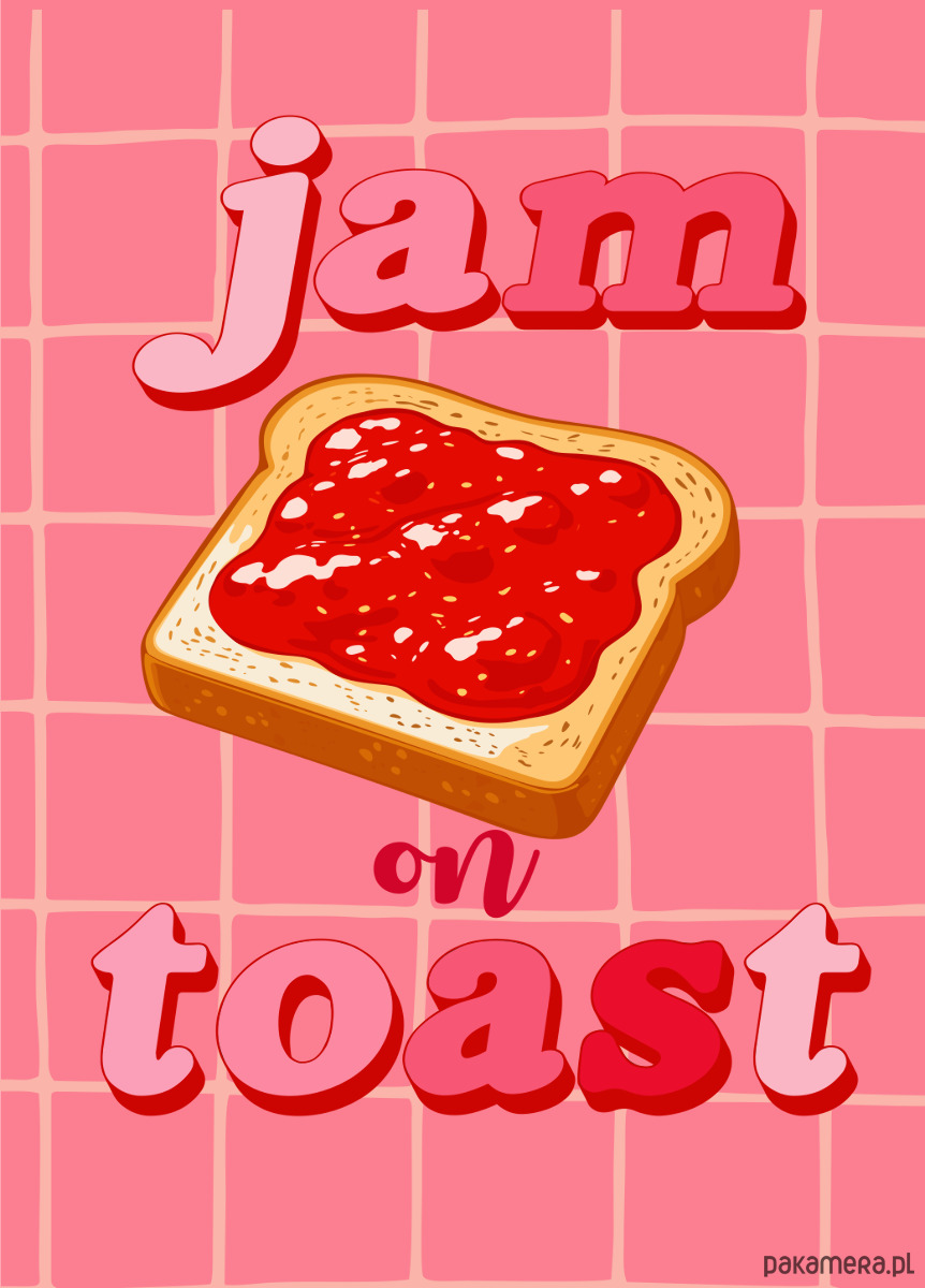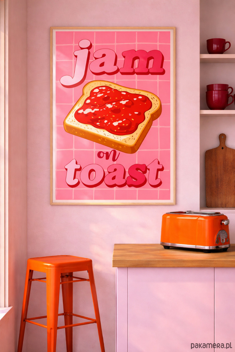 Plakat „Jam on toast” to czysta przyjemność w graficznej formie. Słodki, kolorowy i od razu poprawiający nastrój. Idealny do kuchni, gdzie liczy się nie tylko smak, ale też klimat. Soczysta kolorystyka i miękka, ilustracyjna forma sprawiają, że wnętrze nabiera lekkości i energii. To detal, który przyciąga wzrok i sprawia, że nawet poranna kawa smakuje lepiej. Plakat świetnie odnajdzie się w jasnych, pastelowych przestrzeniach, ale równie dobrze przełamie bardziej neutralne wnętrze. Pasuje do stylu modern retro, dopamine decor i wszystkich aranżacji, które nie boją się koloru. To propozycja dla osób, które lubią design z przymrużeniem oka i chcą dodać swojej przestrzeni czegoś świeżego, lekkiego i trochę zabawnego.