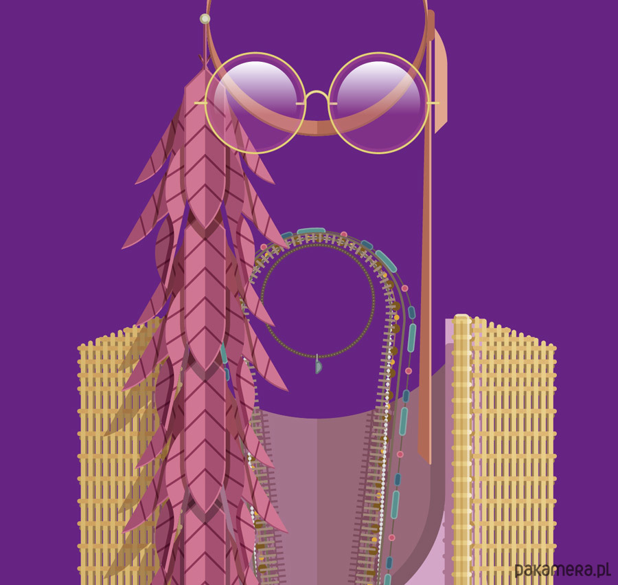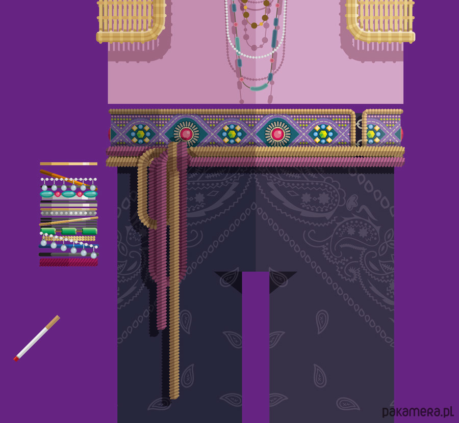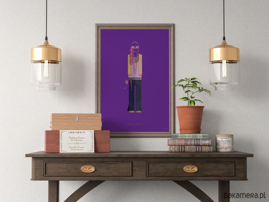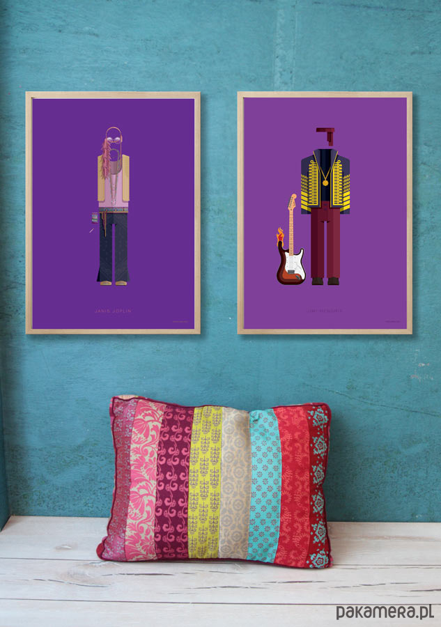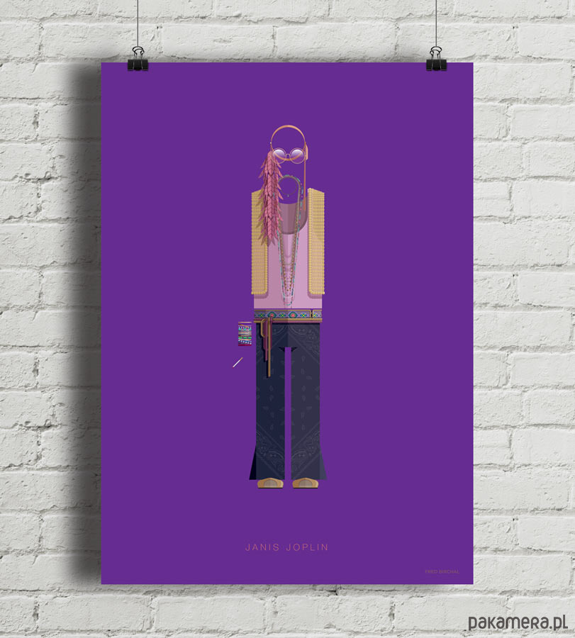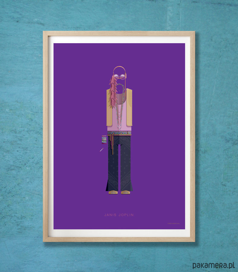 Plakat z autorską grafiką inspirowany piosenkarką Janis Joplin. Pochodzi z serii "Kostiumy muzyczne" i przedstawia hipisowski strój artystki z dzwonami, kolorowymi paciorkami, piórami i charakterystycznymi okularami.