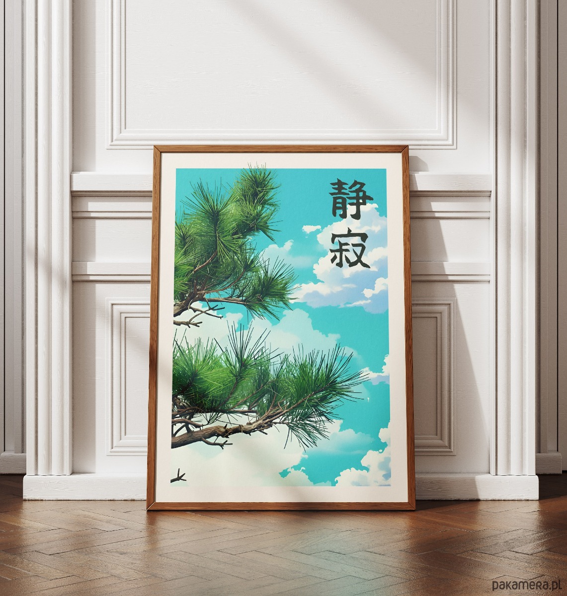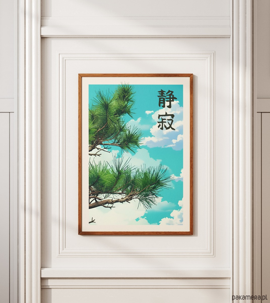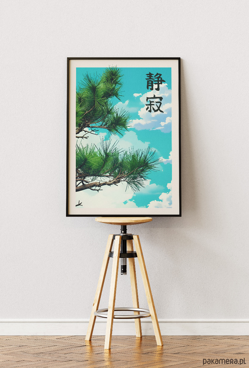 Wprowadź do swojego wnętrza harmonię prosto z japońskich ogrodów. Ten minimalistyczny plakat łączy estetykę anime z tradycyjnym spokojem natury. Głęboka zieleń sosnowych igieł na tle czystego, błękitnego nieba to wizualna kojąca terapia dla oczu.