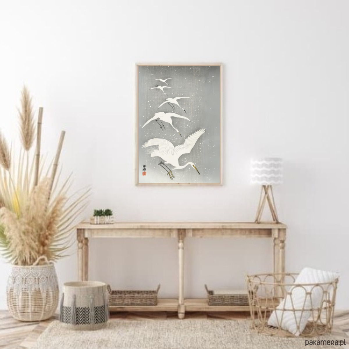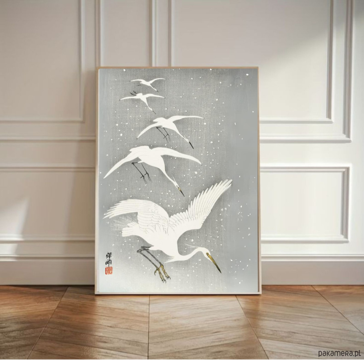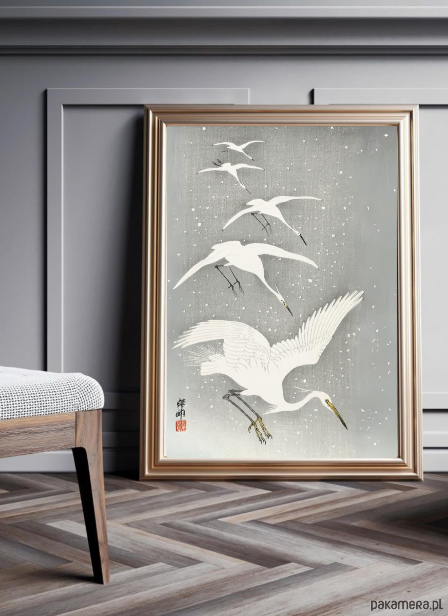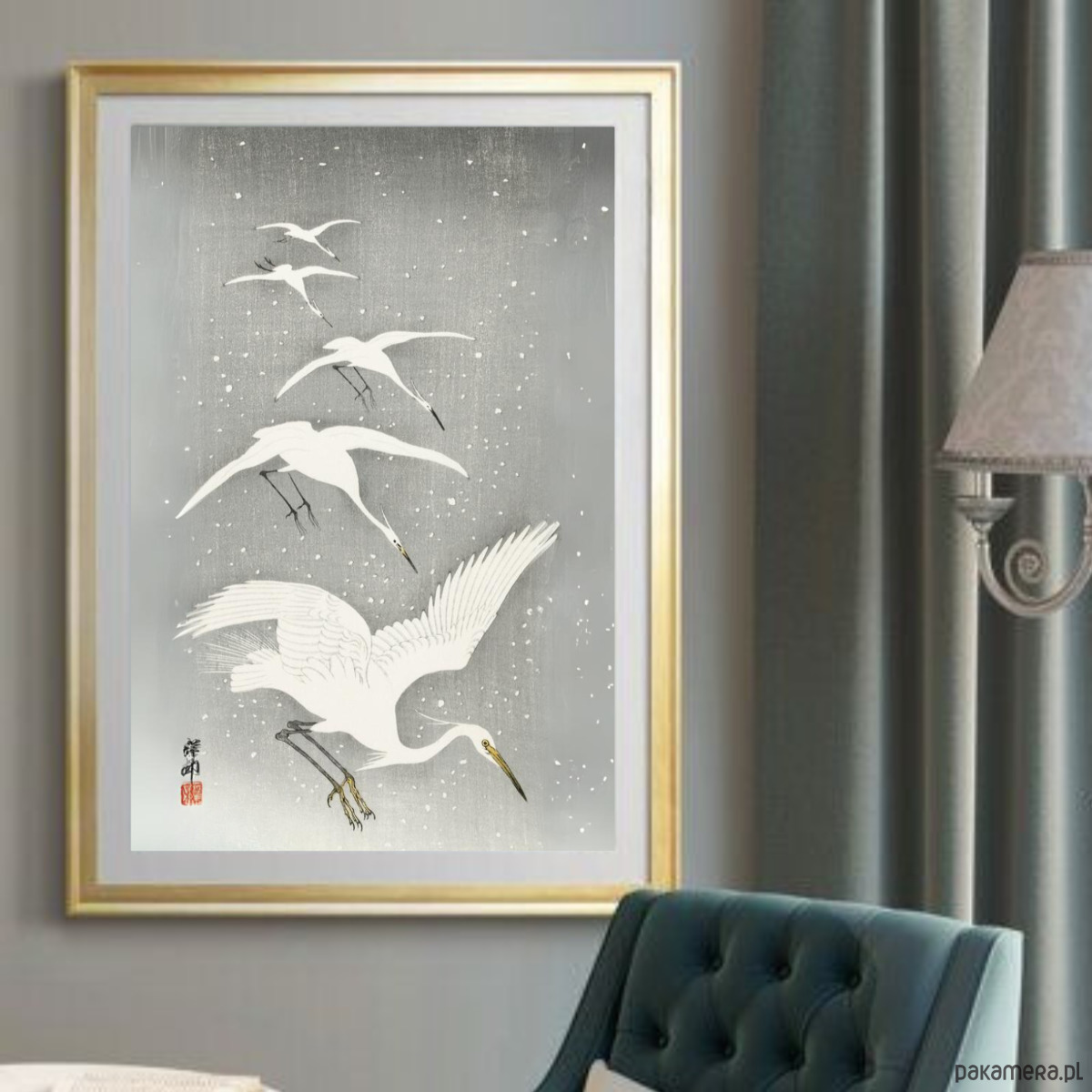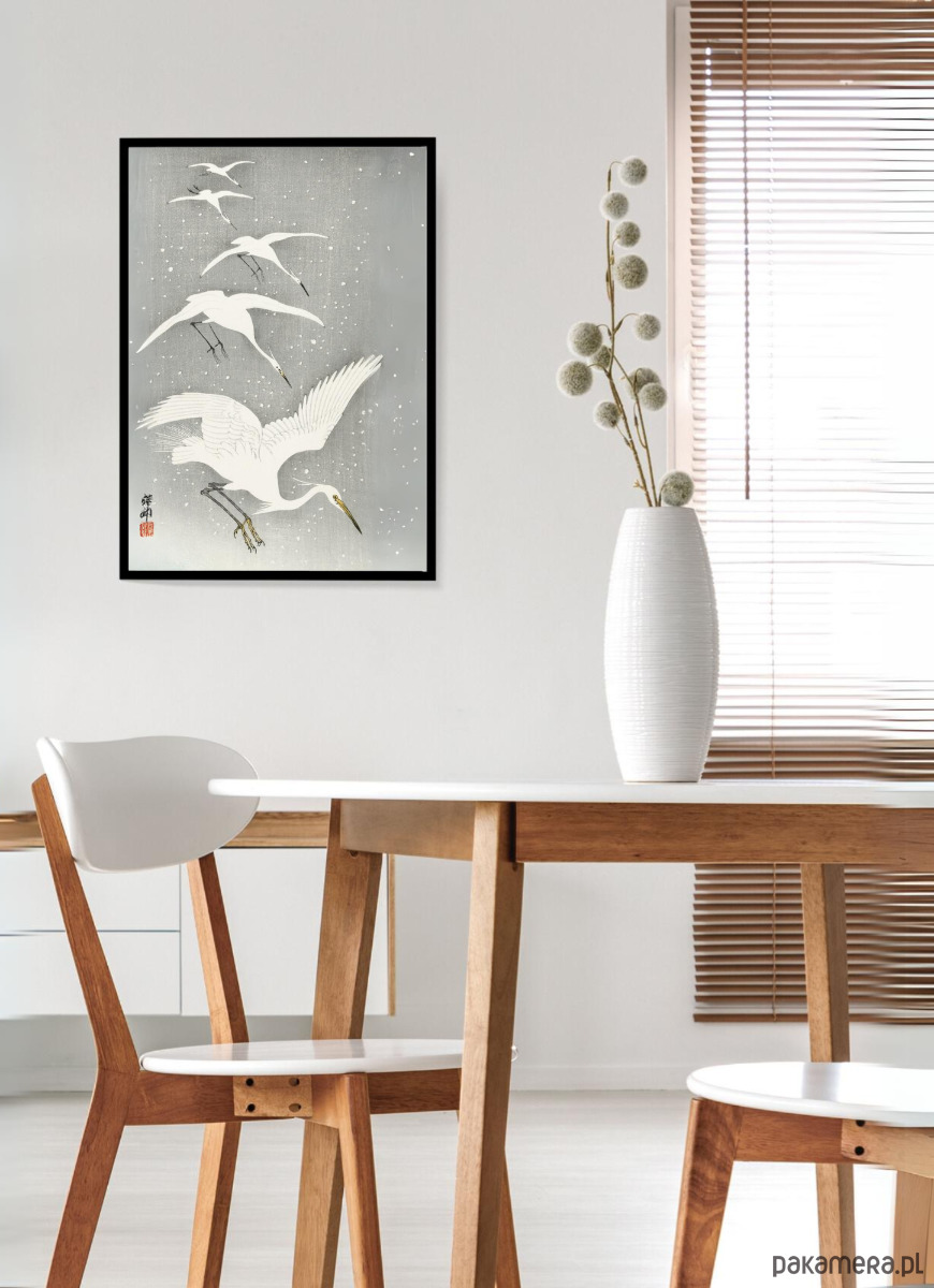PLAKAT japoński, żurawie w locie, ptaki ilustracja szara