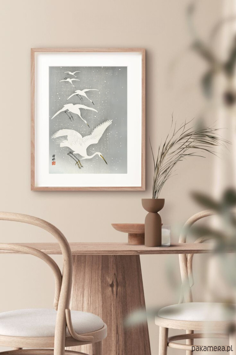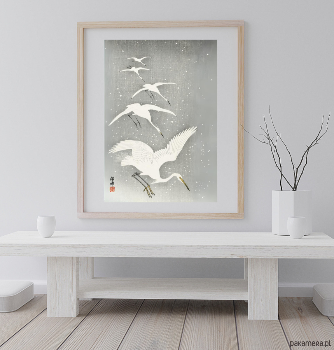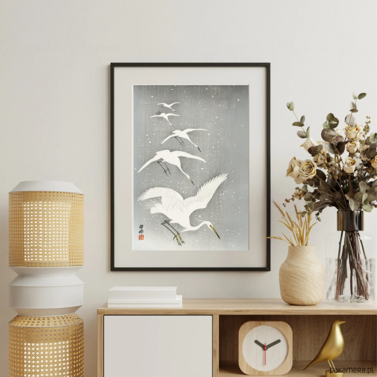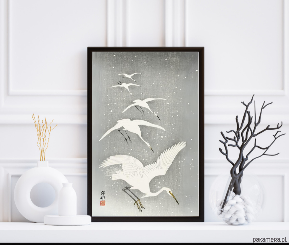 PLAKAT japoński, żurawie w locie, ptaki ilustracja szara