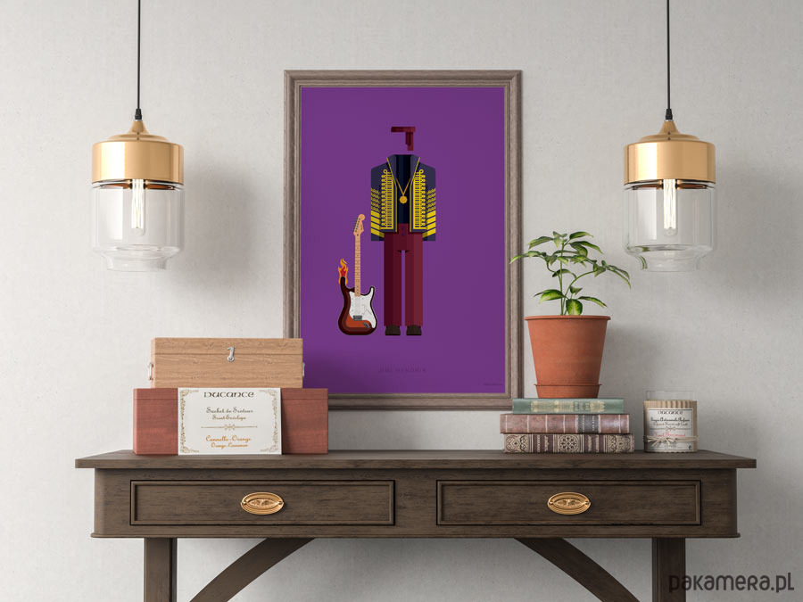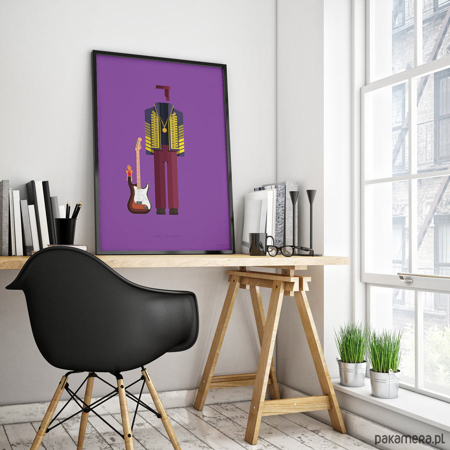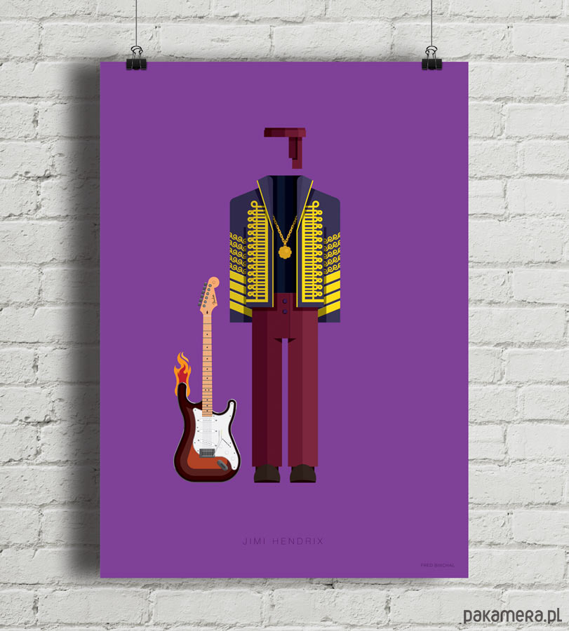 Plakat z autorską grafiką inspirowany Jimim Hendrixem. Pochodzi z serii "Kostiumy muzyczne" i przedstawia charakterystyczną dla gitarzysty wojskową kurtkę - uniform husarii z połowy XIX wieku.