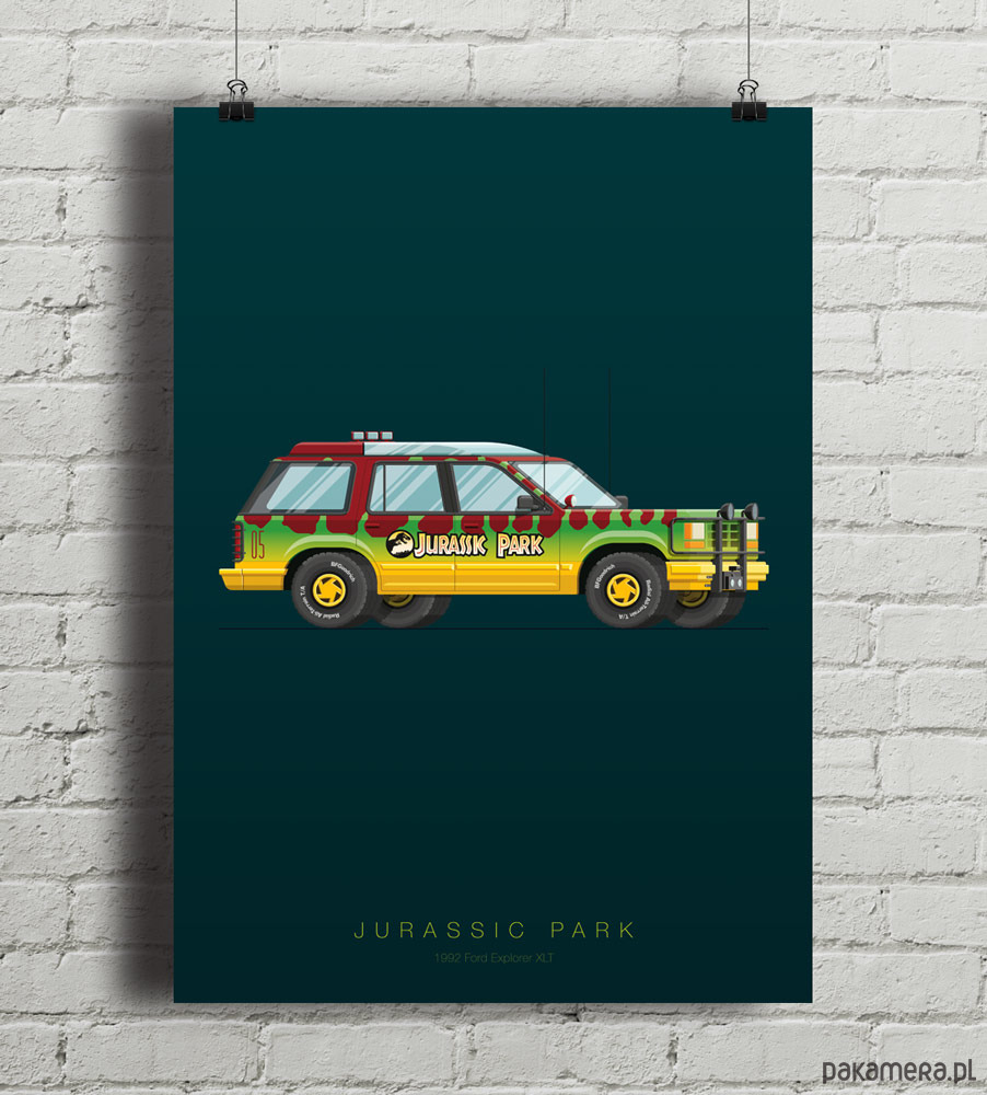 Plakat z autorską grafiką inspirowaną filmem "Park Jurajski" (Jurassic Park), reż. Steven Spielberg. Pochodzi z serii "Słynne samochody" i przedstawia Forda Explorer XLT - model z 1992 roku.