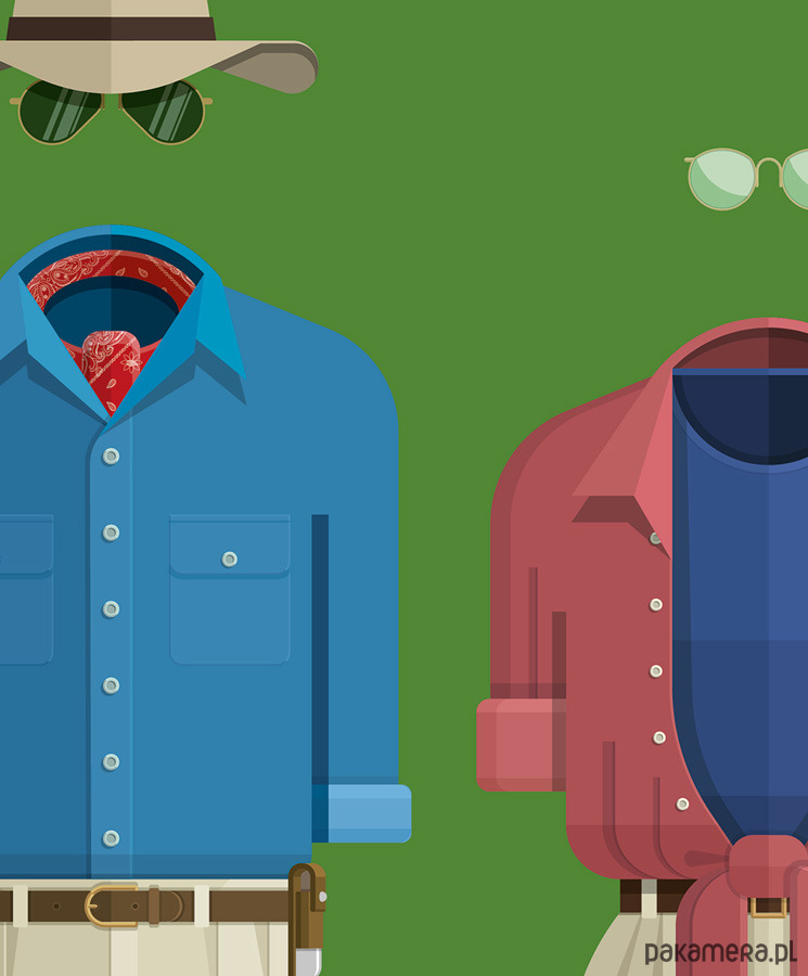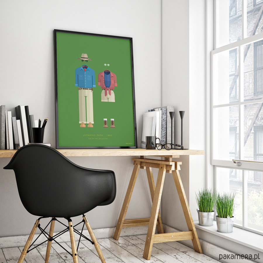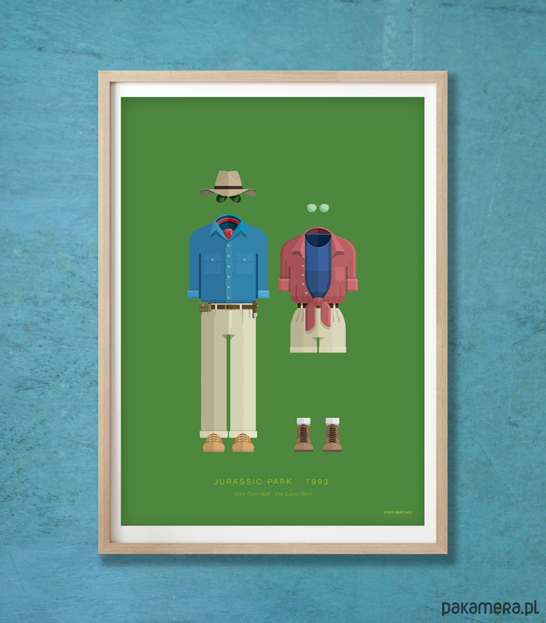 Plakat z autorską grafiką inspirowaną filmem "Park Jurajski" (Jurassic Park), reż. Steven Spielberg. Pochodzi z serii "Cinema Costumes" (Kostiumy kinowe) i przedstawia stroje Granta i Ellie.