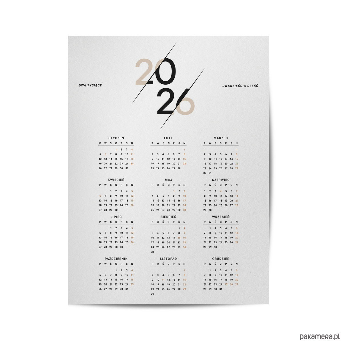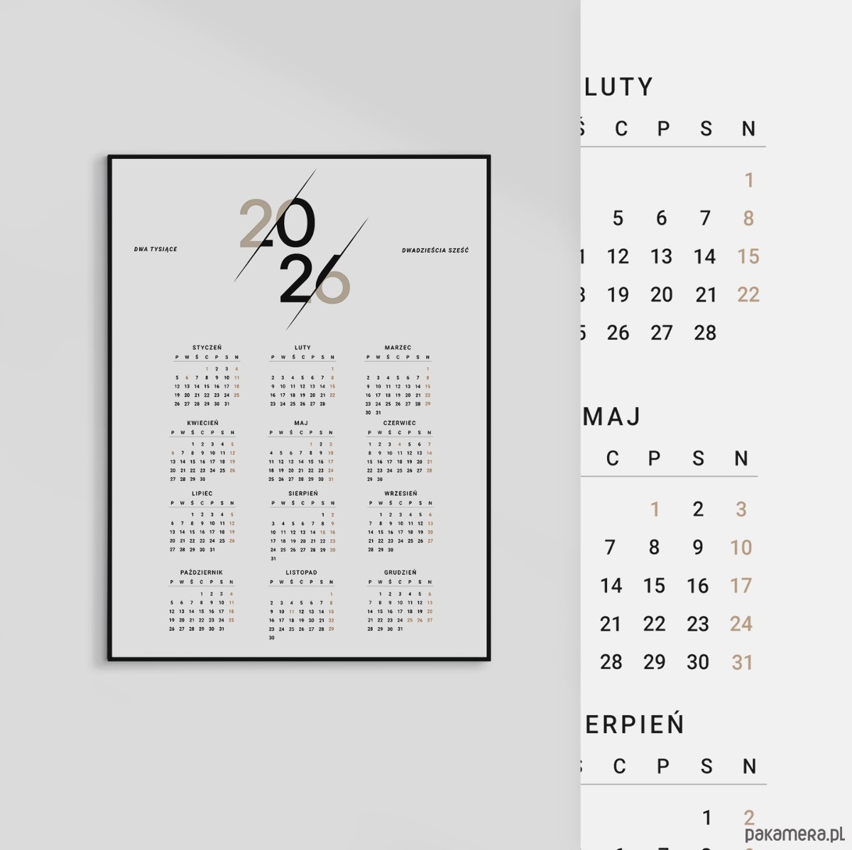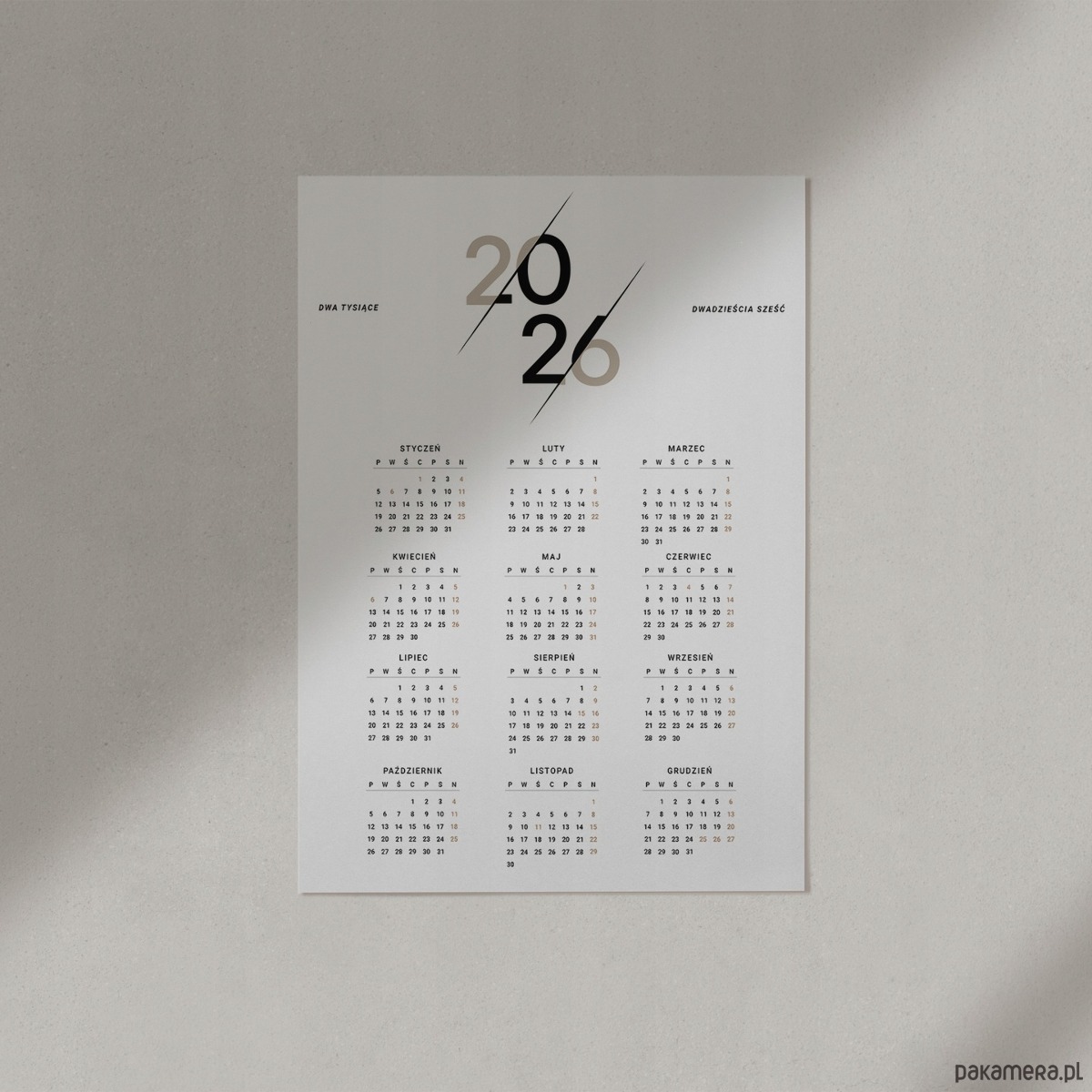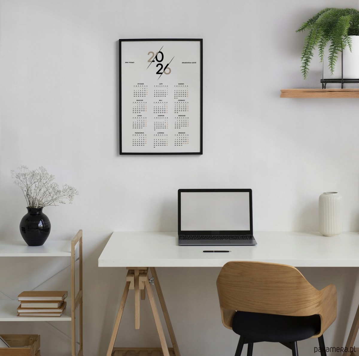 Kalendarz na rok 2026 w formie eleganckiego, minimalistycznego plakatu z dodatkiem beżowych akcentów. Nowoczesny design sprawia, że grafika może być nie tylko praktycznym dodatkiem, ale także stylową dekoracją ściany w biurze, kuchni, przedpokoju czy też sypialni – na przykład nad łóżkiem.
