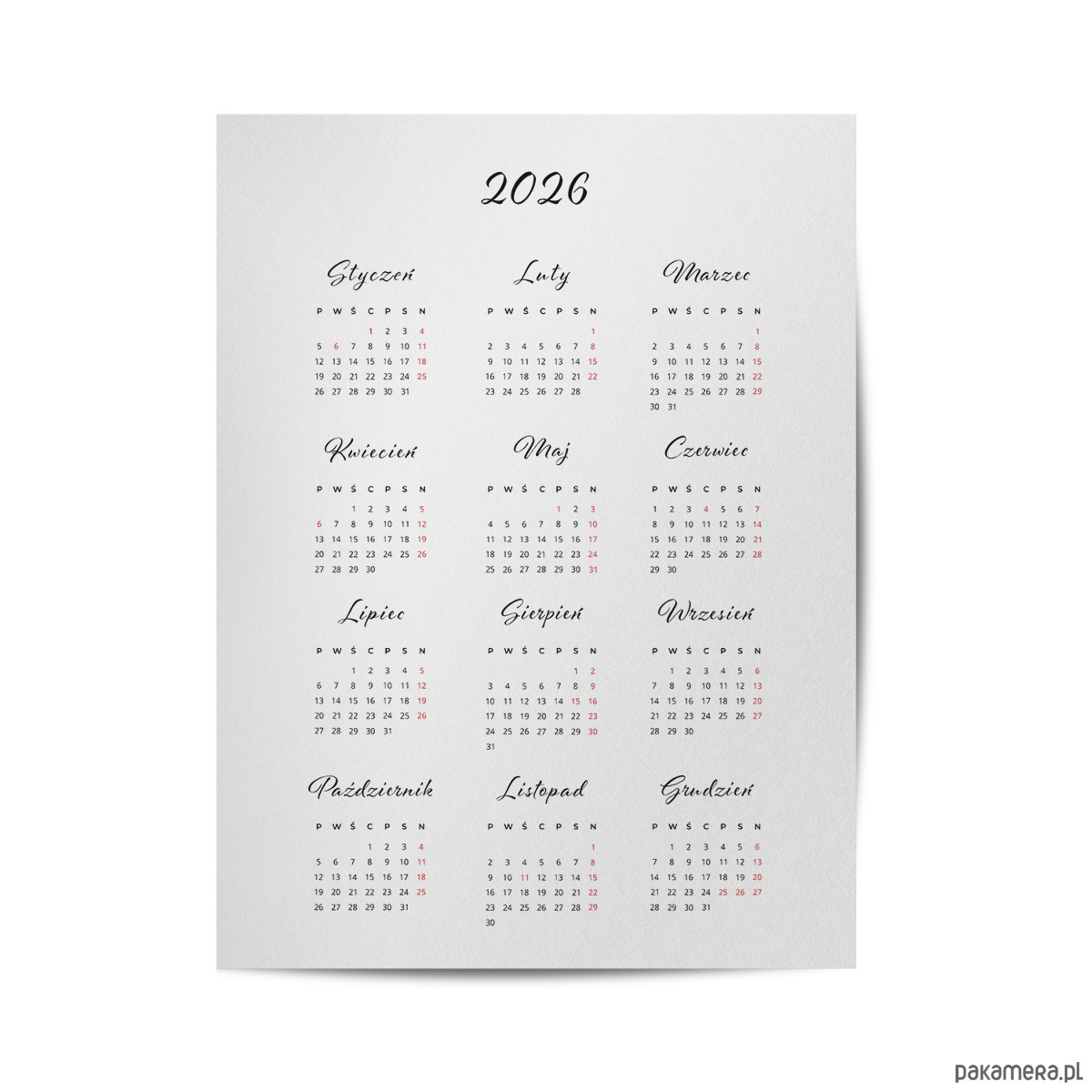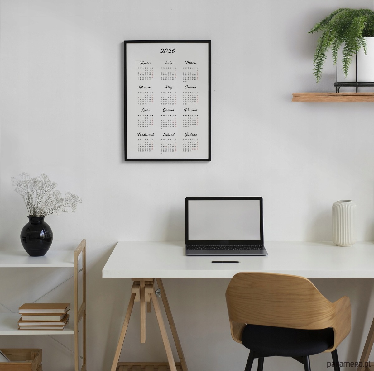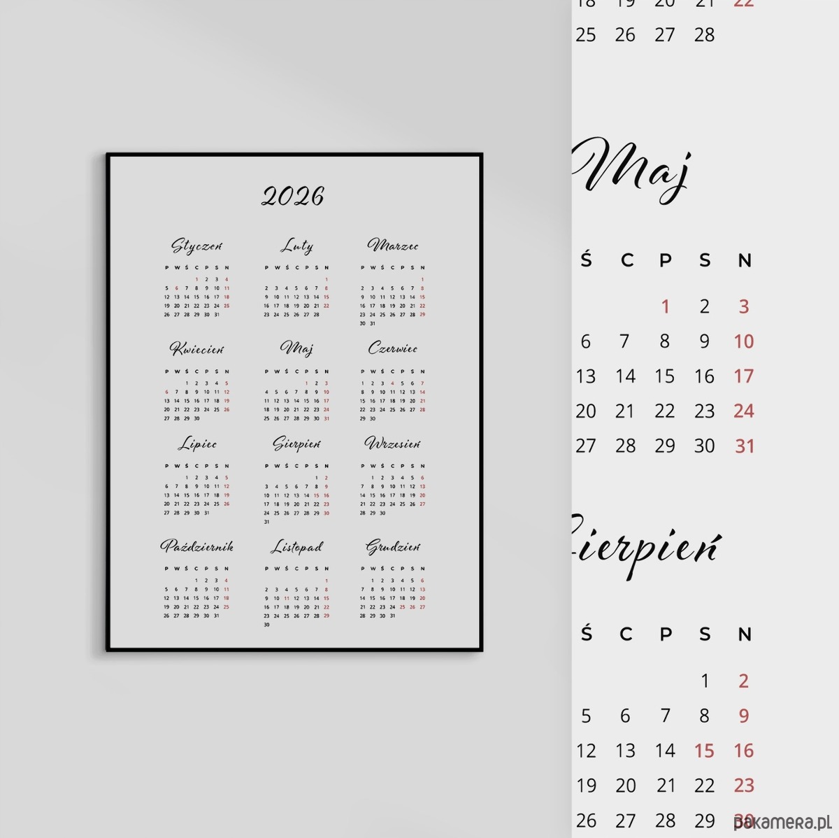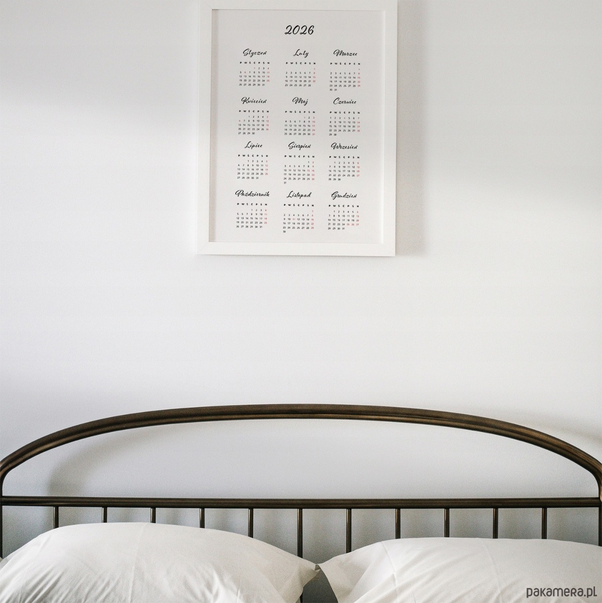 Kalendarz na rok 2026 w formie eleganckiego plakatu. Współczesny, minimalistyczny design sprawia, że grafika może być nie tylko praktycznym dodatkiem, ale także stylową dekoracją ściany w biurze, kuchni, przedpokoju czy też sypialni – na przykład nad łóżkiem.