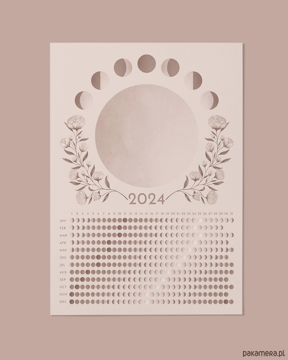Kalendarz faz księżyca na rok 2024 z autorską ilustracją.