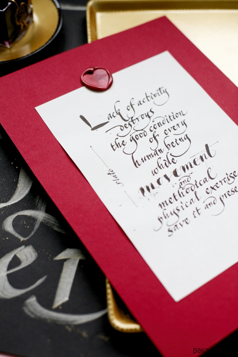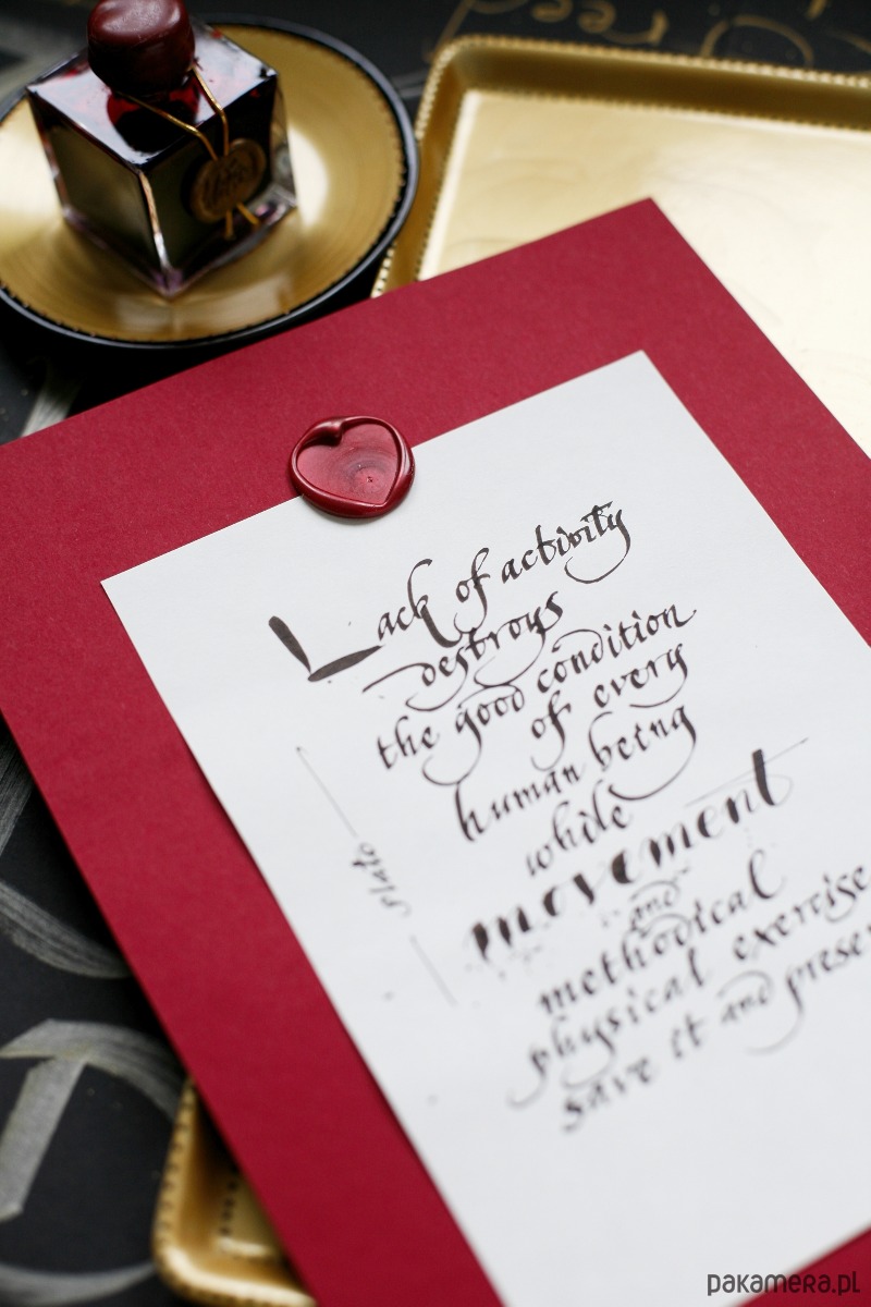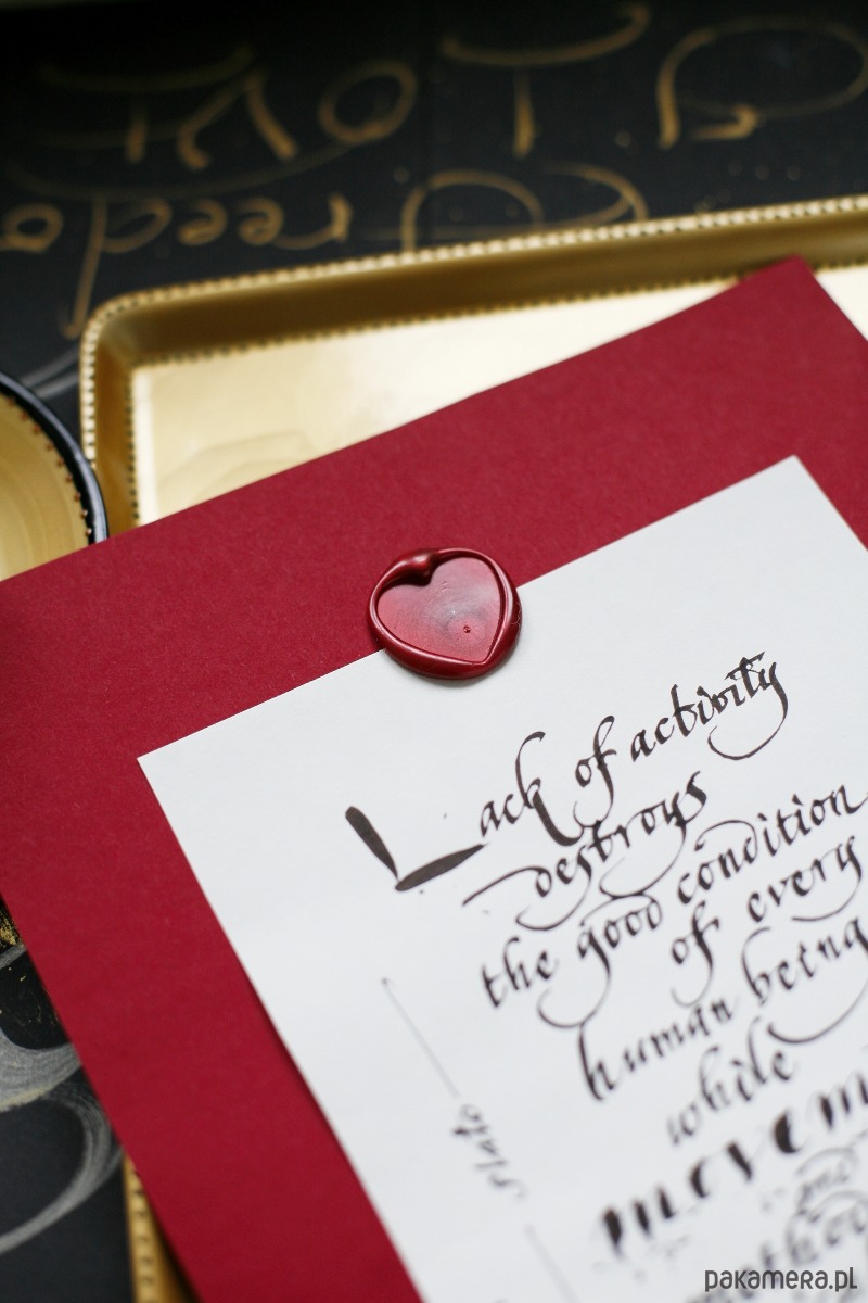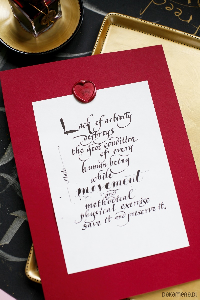 Nieoprawiony cytat Platona o ruchu i bezruchu, wykaligrafowany ręcznie czarnym atramentem, ozdobiony lakiem z sercem, podklejony bordowym kartonem: