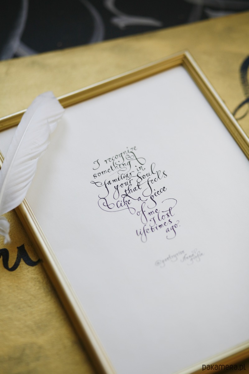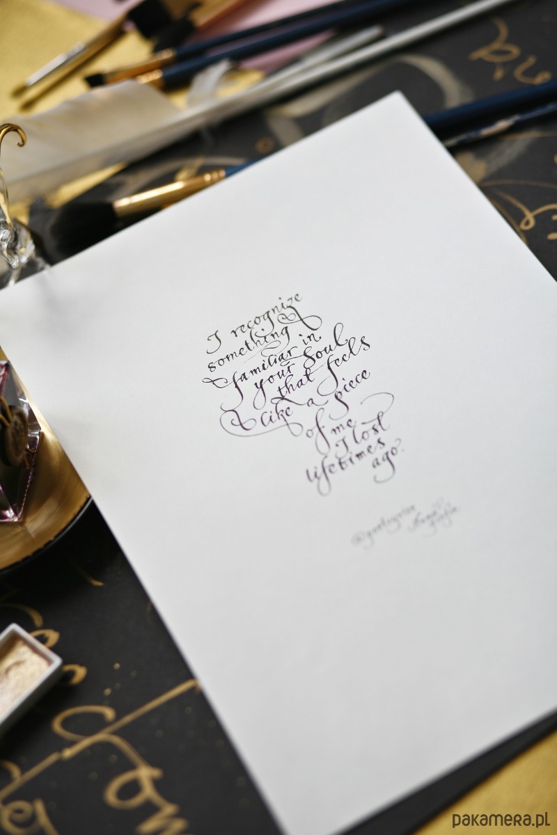 Nieoprawiony cytat wykaligrafowany ręcznie czarnym atramentem ręcznym pismem ozdobnym: