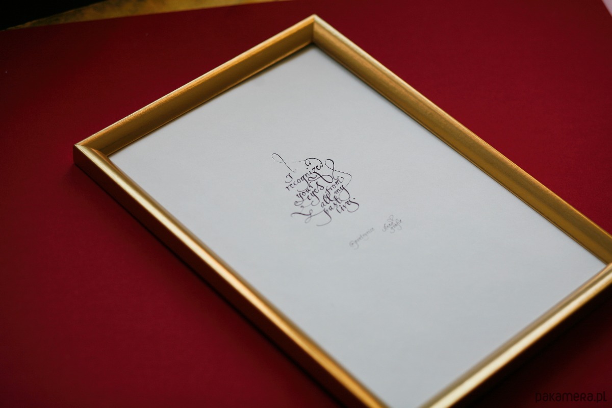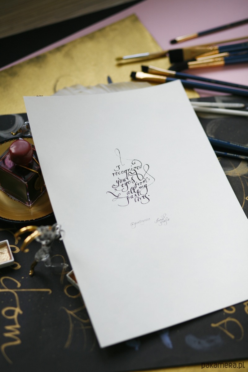 Nieoprawiony cytat wykaligrafowany ręcznie czarnym atramentem ręcznym pismem ozdobnym: