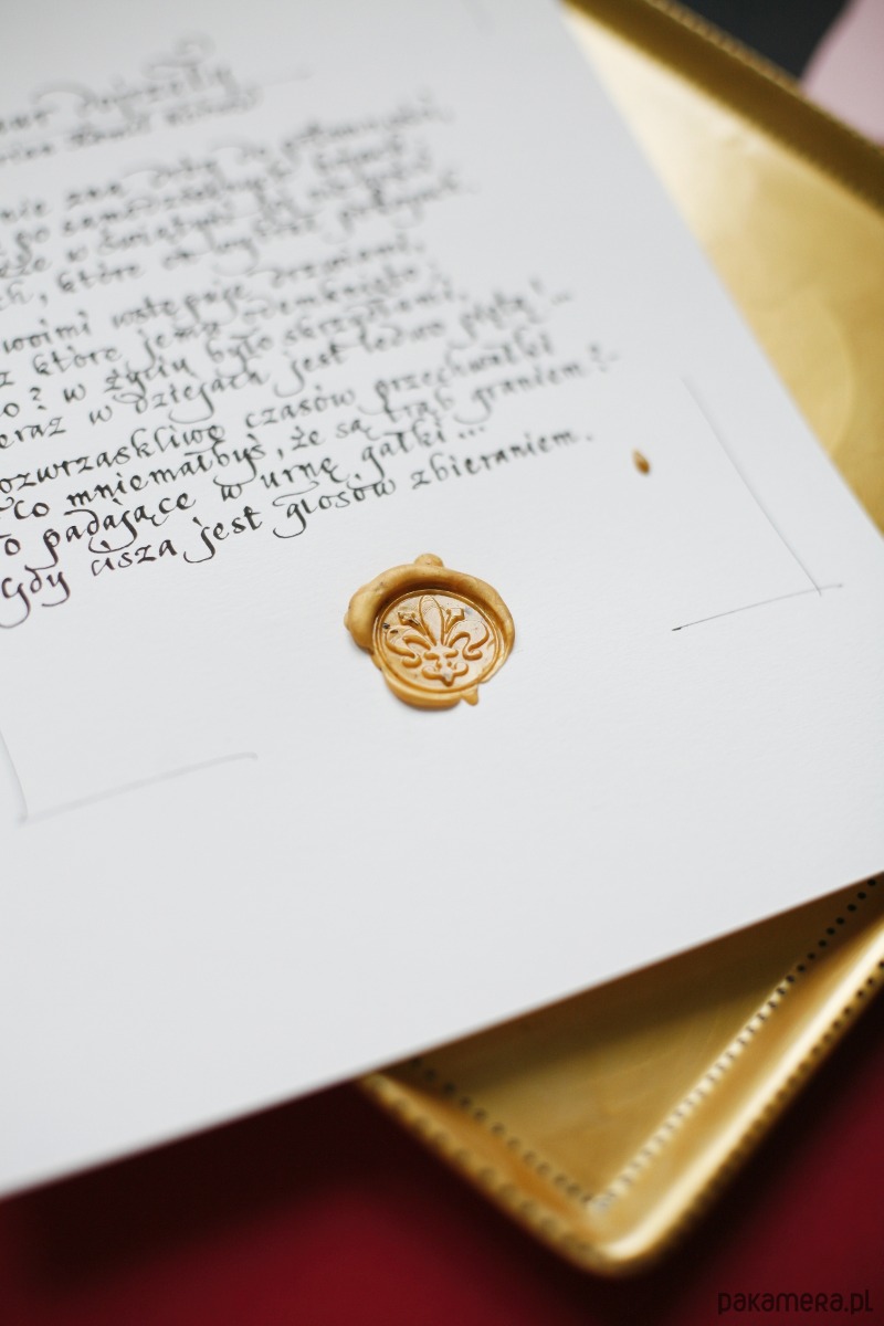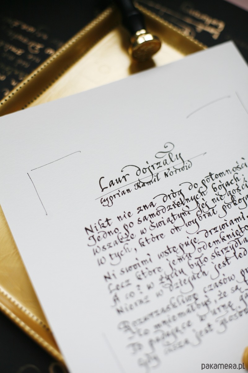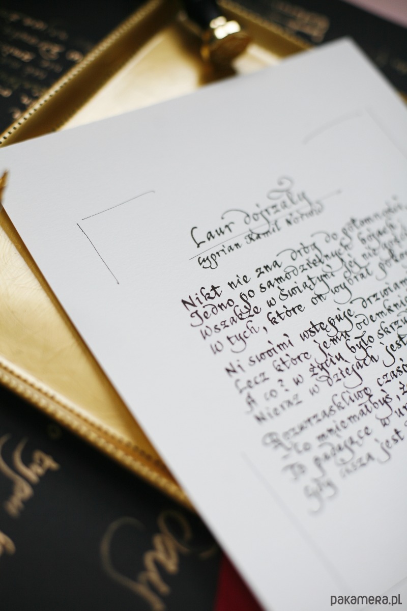 Nieoprawiony wiersz "Laur Dojrzały" Cypriana Kamila Norwida wykaligrafowany ręcznie czarnym atramentem na białym papierze ekologicznym i ozdobiony pieczęcią lakową z symbolem lilii.