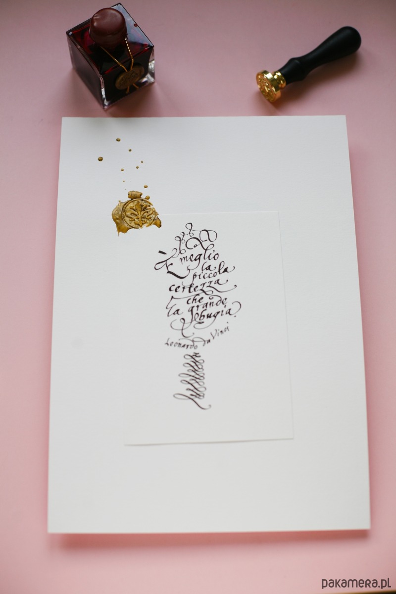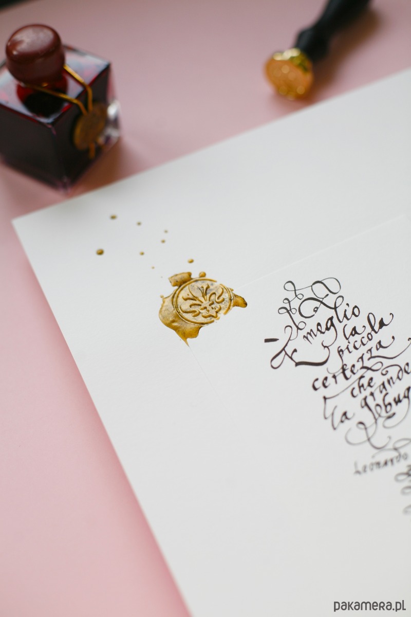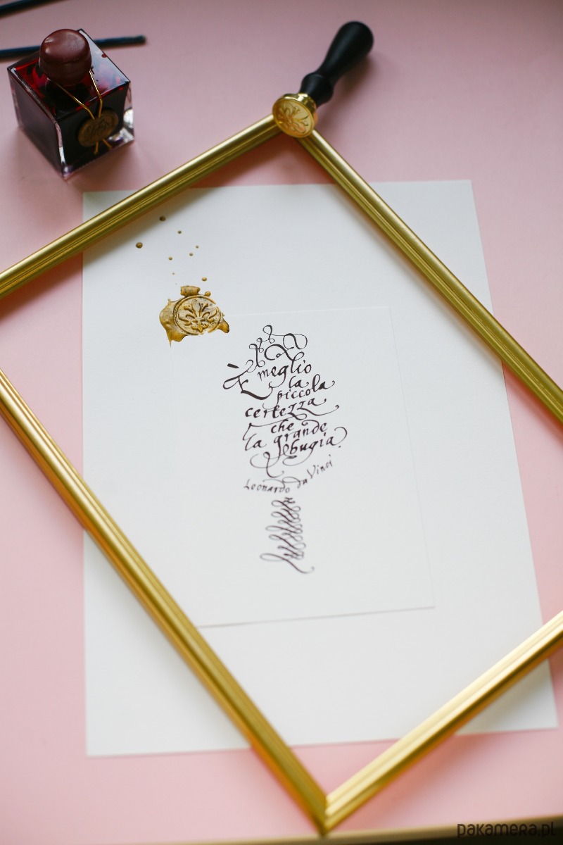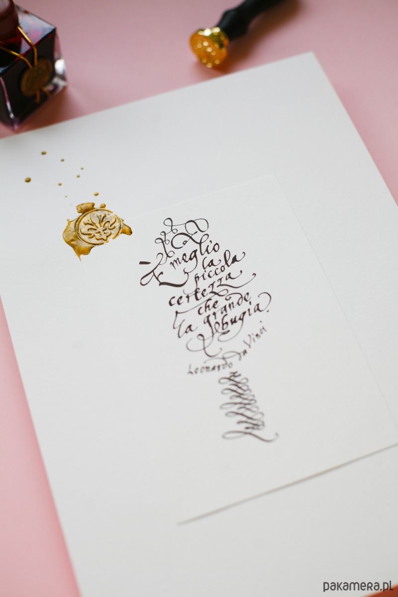 Wyjątkowy plakat z cytatem Leonarda da Vinci, wykaligrafowany ręcznie czarnym atramentem eleganckim pismem ręcznym stylizowanym na kaligrafii z czasów renesansu na włoskim papierze ekologicznym, ozdobiony lakiem z symbolem lilii: