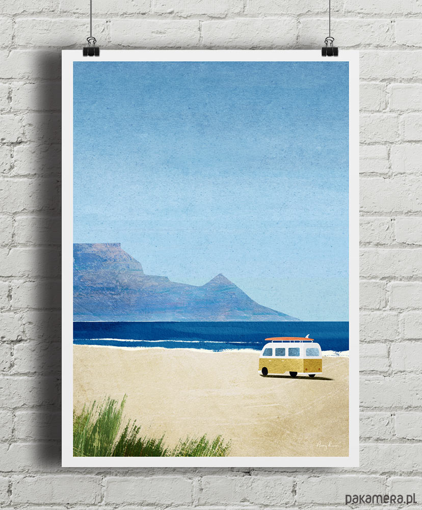 Plakat Kamper na plaży - surfing - to przedstawienie idealnych wakacje. Kamper z deską surfingową na dachu w otoczeniu morskiego krajobrazu, to kwintesencja beztroskiego lata. Z morską grafiką na ścianie łatwo pamiętać, że gdzieś na świecie jest zawsze lato.