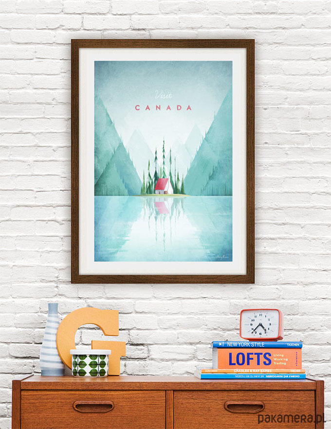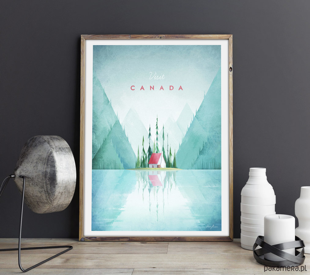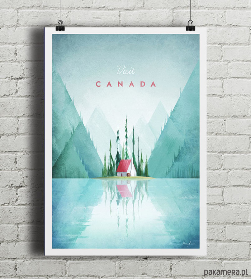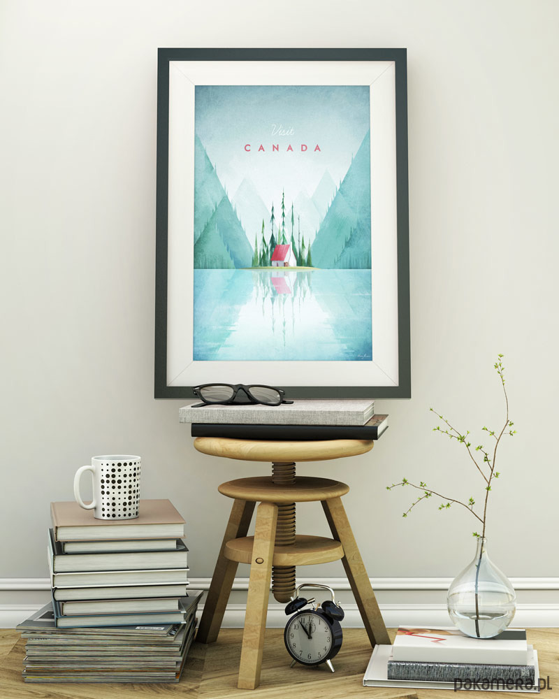 Plakat w stylu vintage przedstawiający ustronny krajobraz kanadyjskiej prowincji, z jeziorem, górami i charakterystycznymi wysokimi sekwojami.