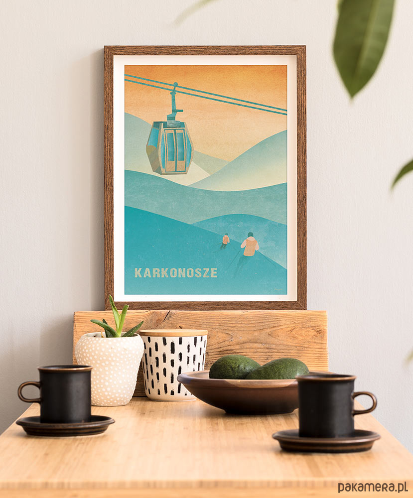 Zimowe Karkonosze na naszym plakacie przeniosą Cię na ośnieżone stoki oświetlone ostatnimi promieniami pomarańczowego słońca. Na pierwszym planie narciarze zmagają się z kolejnymi wzniesieniami, a nad nimi unosi się gondola. Plakat z Karkonoszami to idealny pomysł na wystrój wnętrza dla każdego miłośnika nart i gór.