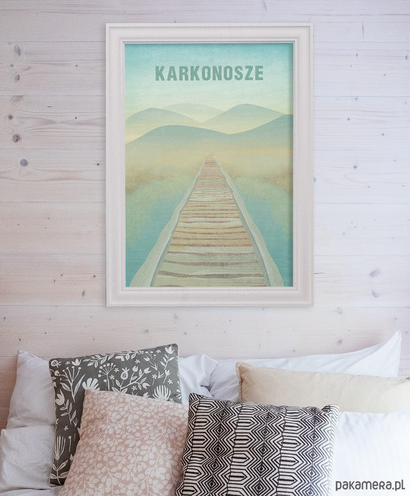 Autorski plakat Karkonosze przedstawia charakterystyczną drewnianą kładkę z panoramą gór. Utrzymany w błękitach i zieleniach przywodzi na myśl wyprawy wczesną porą, gdy jeszcze wszystko tonie w delikatnej mgle. Piękna dekoracja domu dla każdego miłośnika polskich gór.