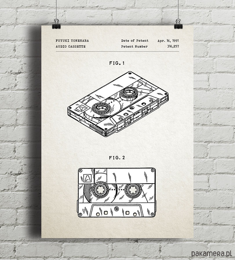Plakat z reprodukcją patentu na kasetę magnetofonową, autorstwa Fuyuki Yonehary. Patent o numerze 316,257 został udzielony w 1991 roku przez Urząd Patentów i Znaków Towarowych Stanów Zjednoczonych.