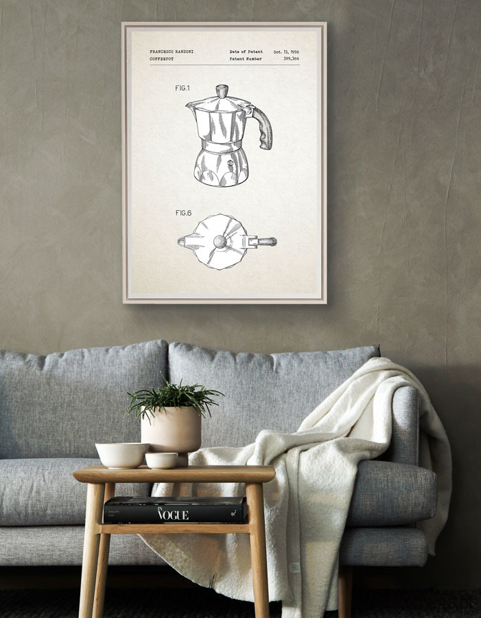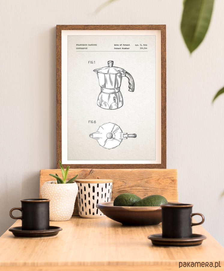 Plakat z reprodukcją patentu na kawiarkę, autorstwa F. Ranzoni. Patent o numerze 399384 został udzielony w 1998 roku przez Urząd Patentów i Znaków Towarowych Stanów Zjednoczonych.