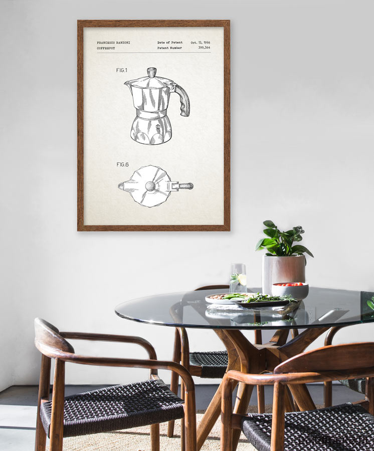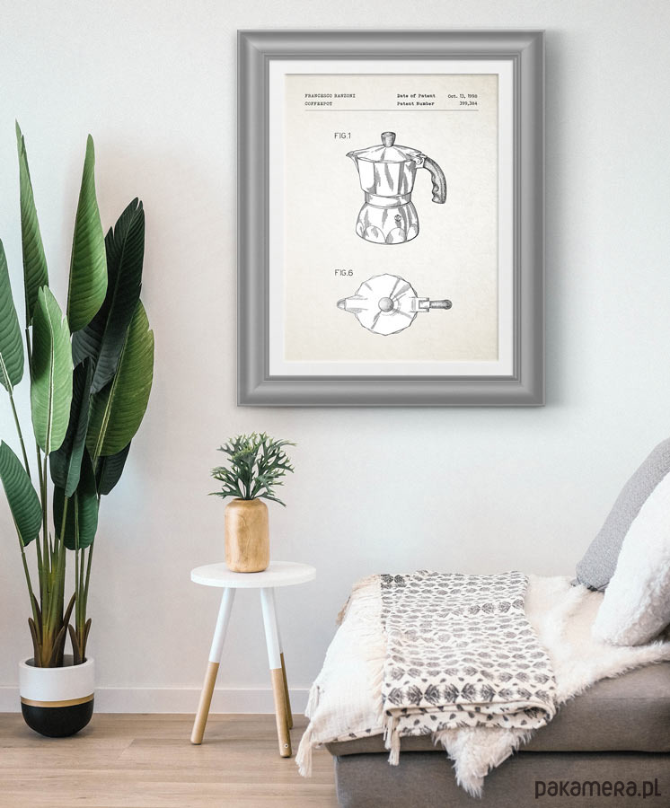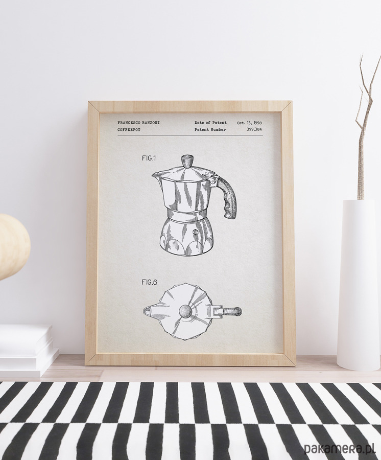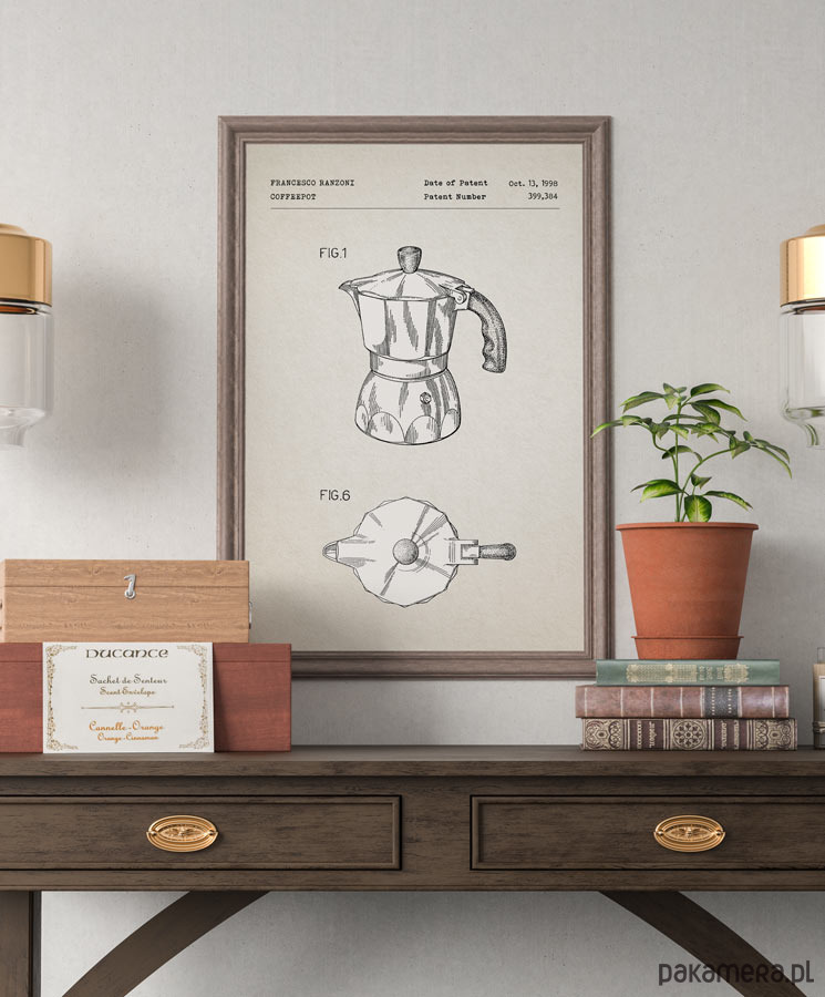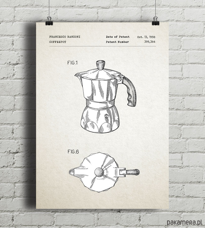 Plakat z reprodukcją patentu na kawiarkę, autorstwa F. Ranzoni. Patent o numerze 399384 został udzielony w 1998 roku przez Urząd Patentów i Znaków Towarowych Stanów Zjednoczonych.