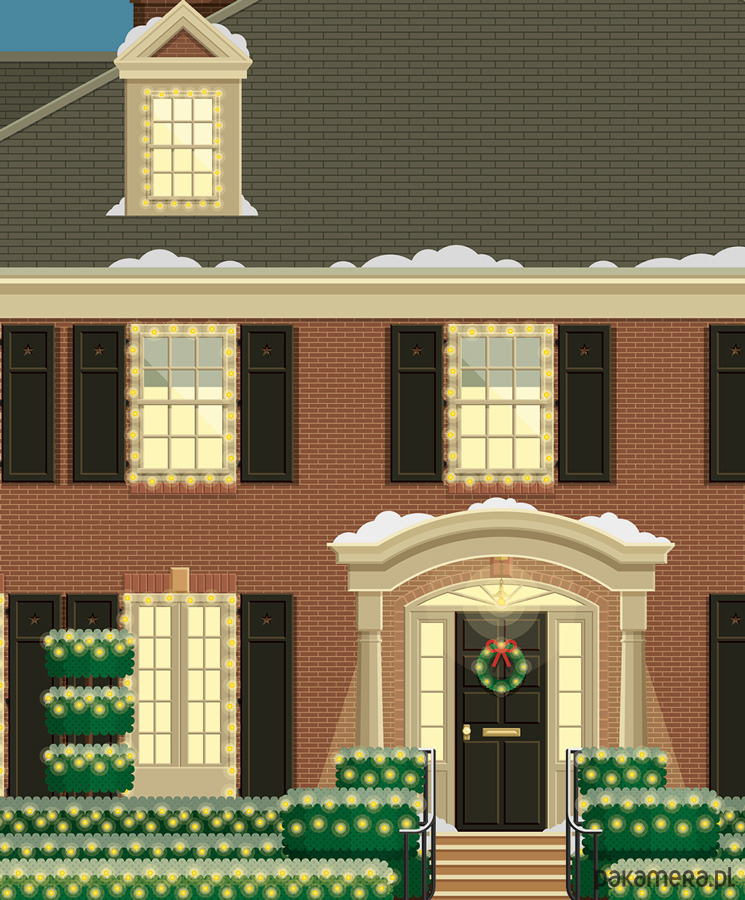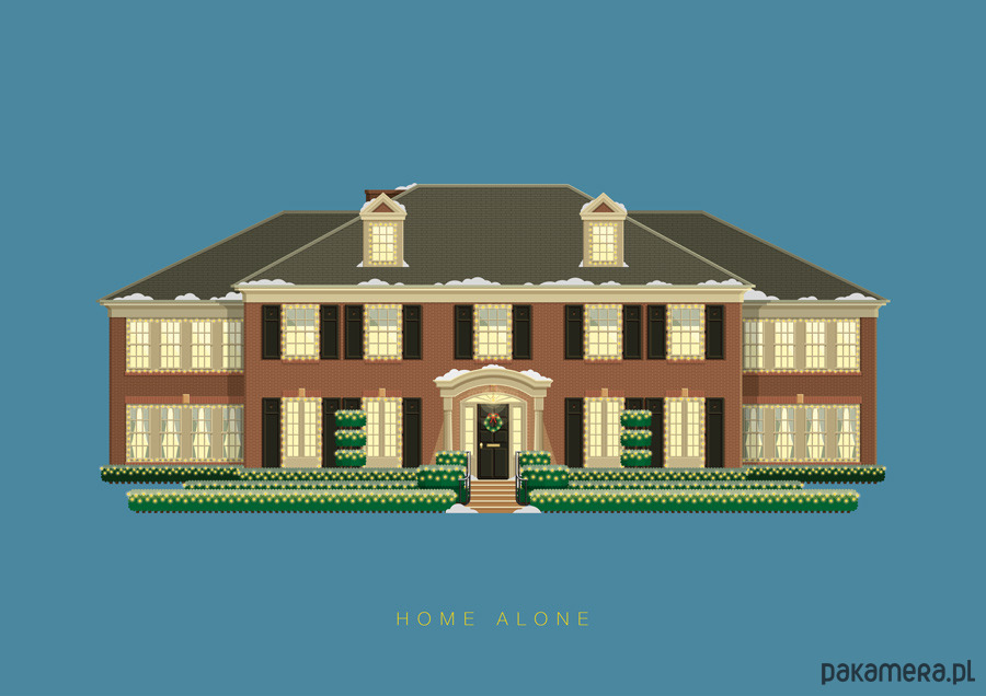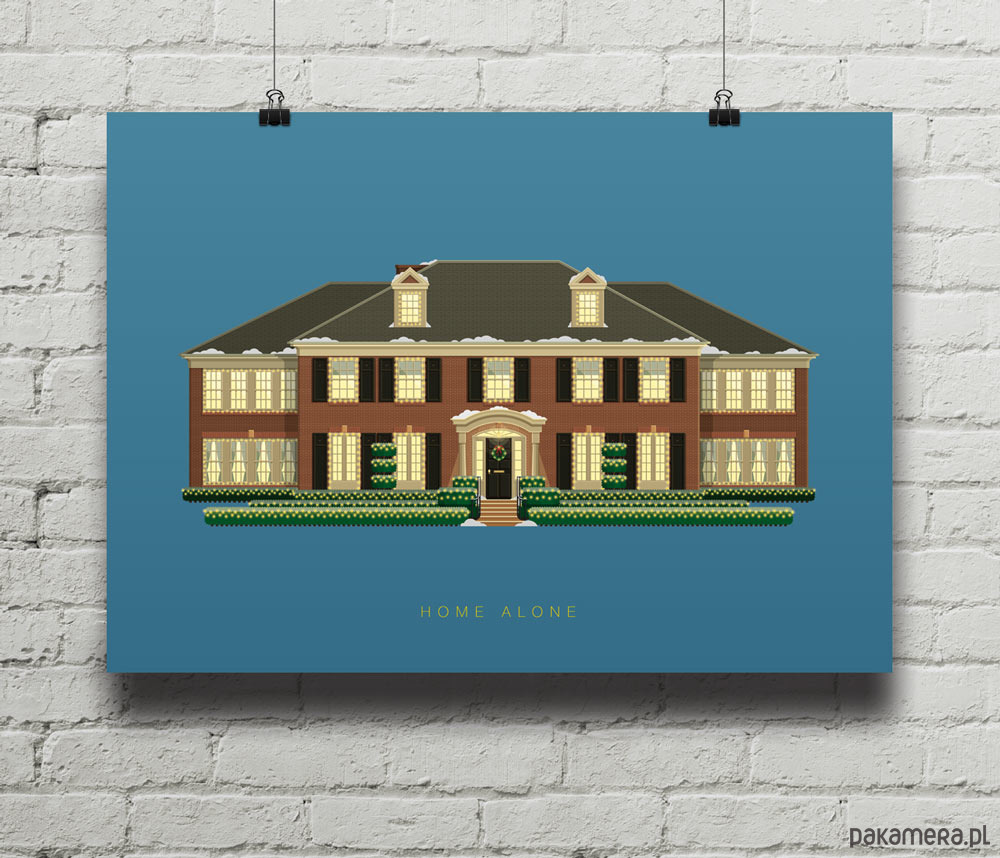 Plakat z autorską grafiką inspirowaną filmem "Kevin Sam w Domu" (Home Alone), reż. Chris Columbus. Pochodzi z serii "Słynne scenerie" i przedstawia dom rodziny McCallisterów.
