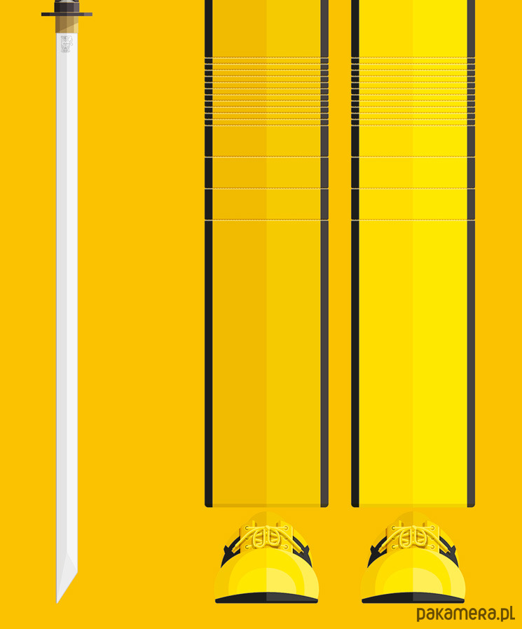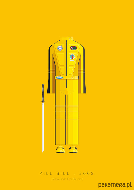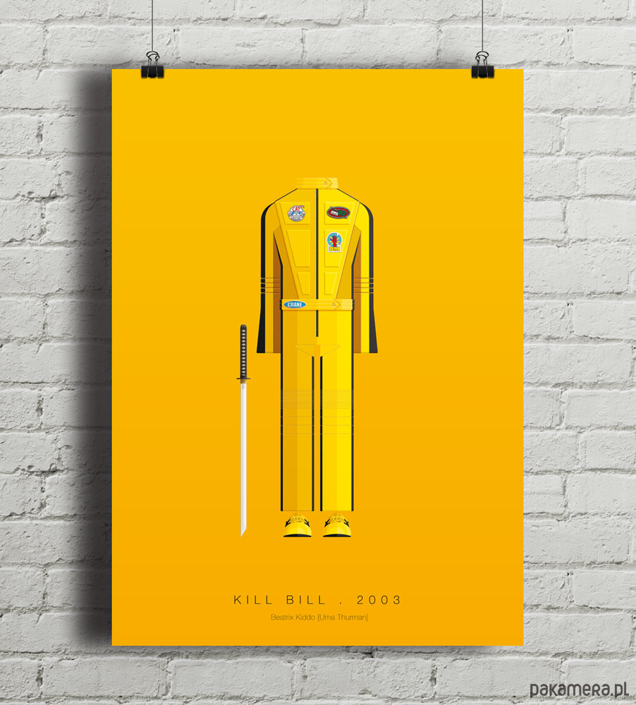 Plakat z autorską grafiką inspirowaną filmem "Kill Bill", reż. Quentin Tarantino. Pochodzi z serii "Kostiumy z telewizji i kina" i przedstawia strój Panny Młodej.