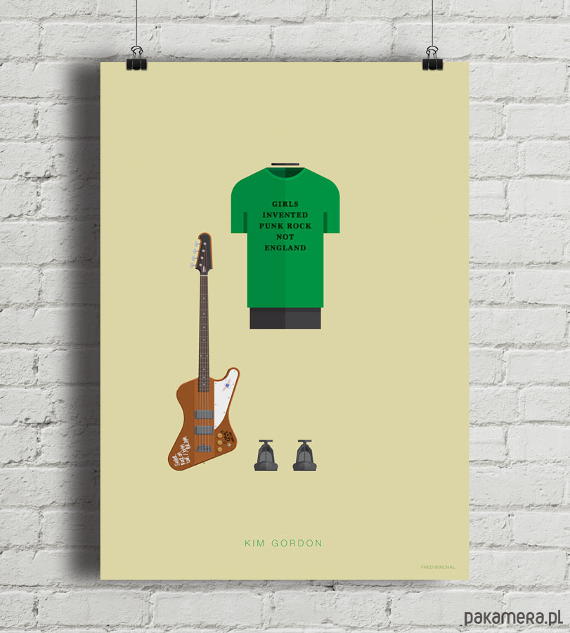 Plakat z autorską grafiką inspirowany wokalistką i basistką zespołu Sonic Youth, Kim Gordon. Pochodzi z serii "Kostiumy muzyczne" i przedstawia luźny, sceniczny strój artystki - szorty i koszulka z feministycznym hasłem.
