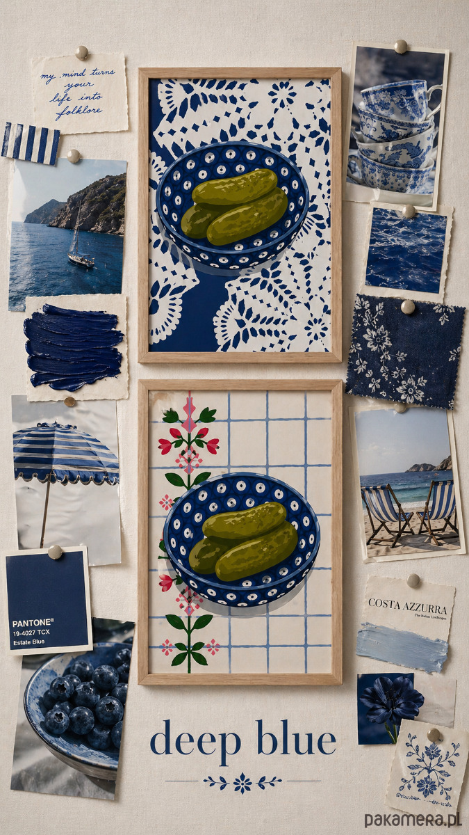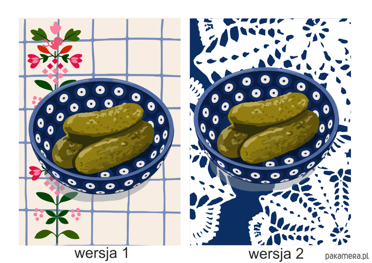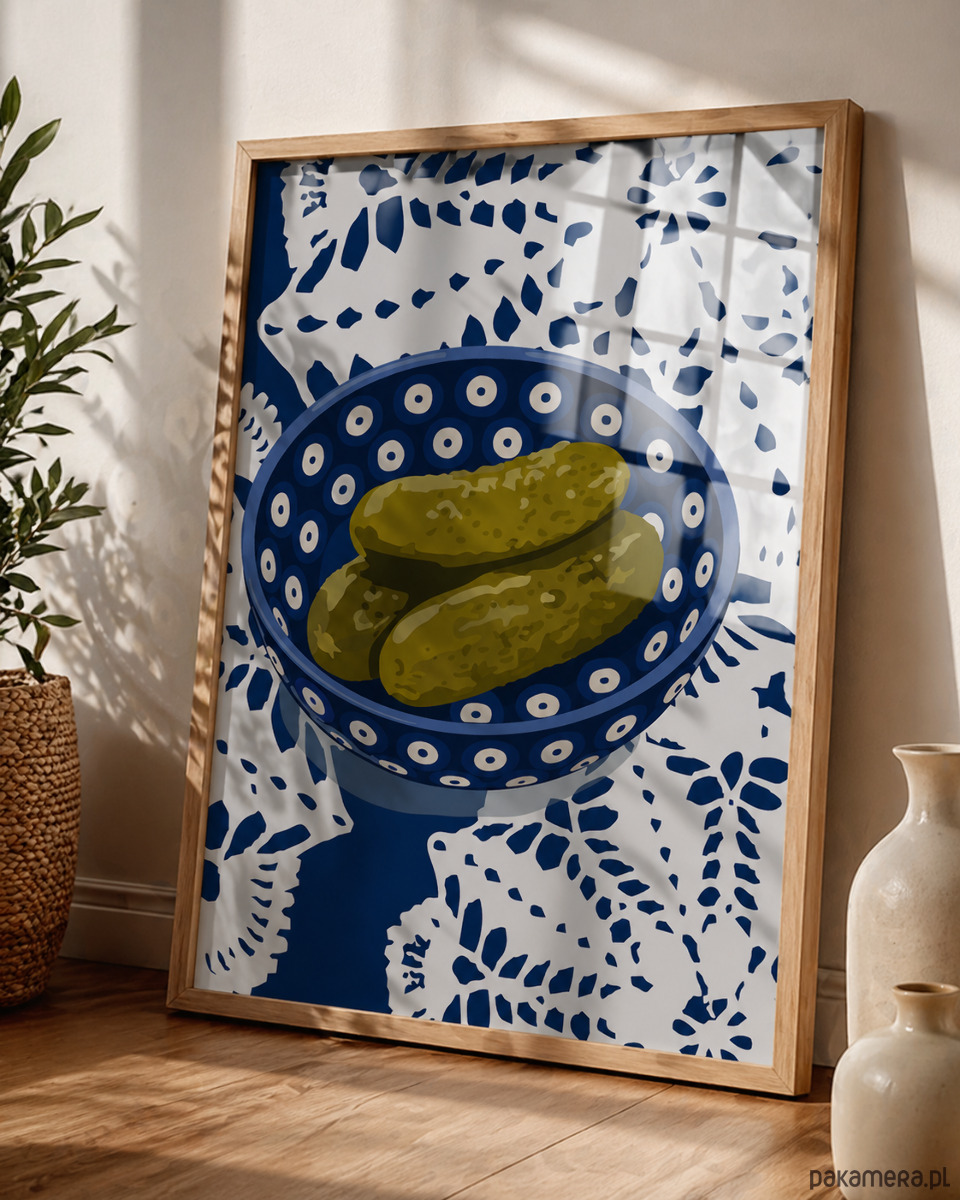 Czasem najlepsze pomysły rodzą się z rzeczy najprostszych. Tak było tutaj. Zwykła scena z kuchni, ogórki kiszone w misce, zatrzymana i zamieniona w graficzną formę. To Ola wymyśliła taki zestaw, ogórki w misce z Bolesławca a ja nadałam temu pomysłowi kształt. Codzienność stała się inspiracją, a tradycja spotkała się z nowoczesnym rysunkiem. Wzór inspirowany porcelaną bolesławiecką przywołuje znajome skojarzenia, ale w świeżym, uproszczonym wydaniu. Dzięki temu plakat dobrze w kuchni, restauracji albo w salonowej galerii niepoważnych plakatów.