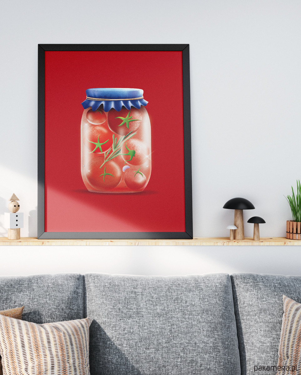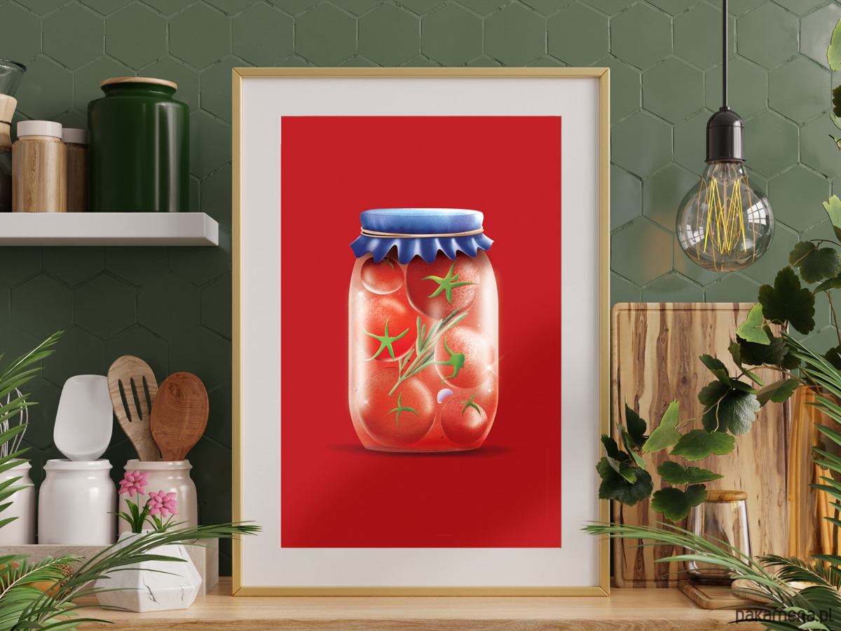 "Kiszonki - pomidory" to kolejna odsłona z serii Kiszonki – graficzny hołd dla domowych tradycji i smaków, które budzą sentyment. Soczyście czerwone pomidory w minimalistycznej oprawie przyciągają wzrok i dodają wnętrzu charakteru. Ten plakat świetnie sprawdzi się w kuchni, jadalni, ale i wszędzie tam, gdzie króluje dobre jedzenie i ciepła atmosfera. To ukłon w stronę tych małych rzeczy, które cieszą najbardziej. Tak szczerze, czy wyobrażasz sobie kuchnię bez pomidorów?