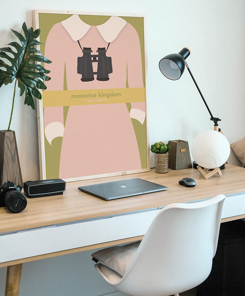 Plakat z autorską grafiką inspirowany filmem ochankowie Z Księżyca (Moonrise Kingdom), reż. Wes Anderson. Grafika nawiązuje do jednej z głównych postaci - Suzy Bishop z jej nieodłączną lornetką i stylizowaną na lata 60-te sukienką.