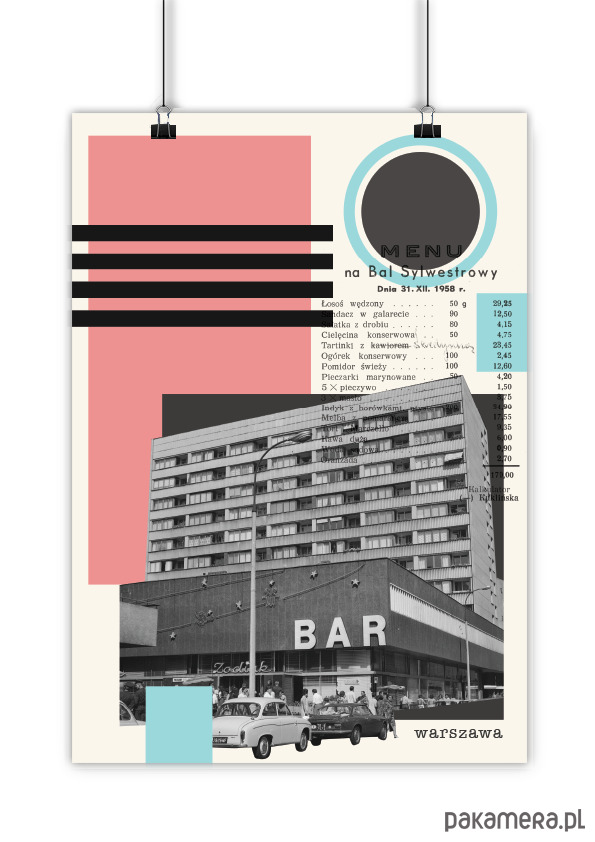 Plakat w formie kolażu - bar mleczny, dawne menu oraz geometryczne wzory.
