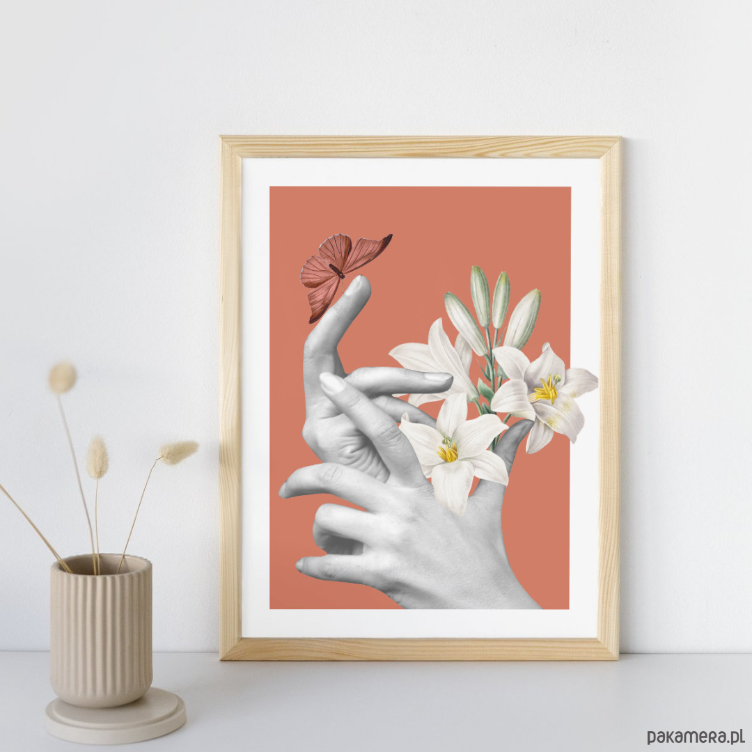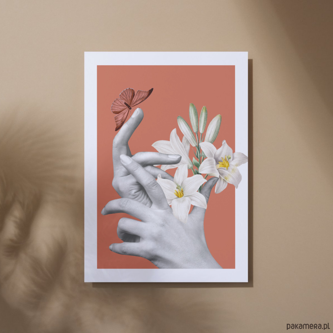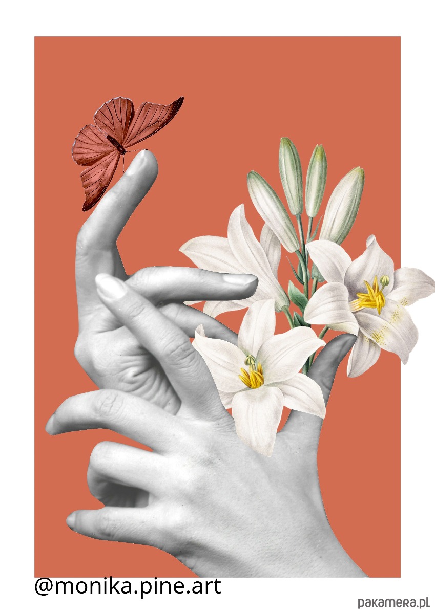 Z dłoni wyłaniają się białe lilie, spokojne, pełne naturalnej elegancji. Ich obecność przywodzi na myśl troskę, intymność i życie, które rodzi się tam, gdzie jest miejsce na uważność.