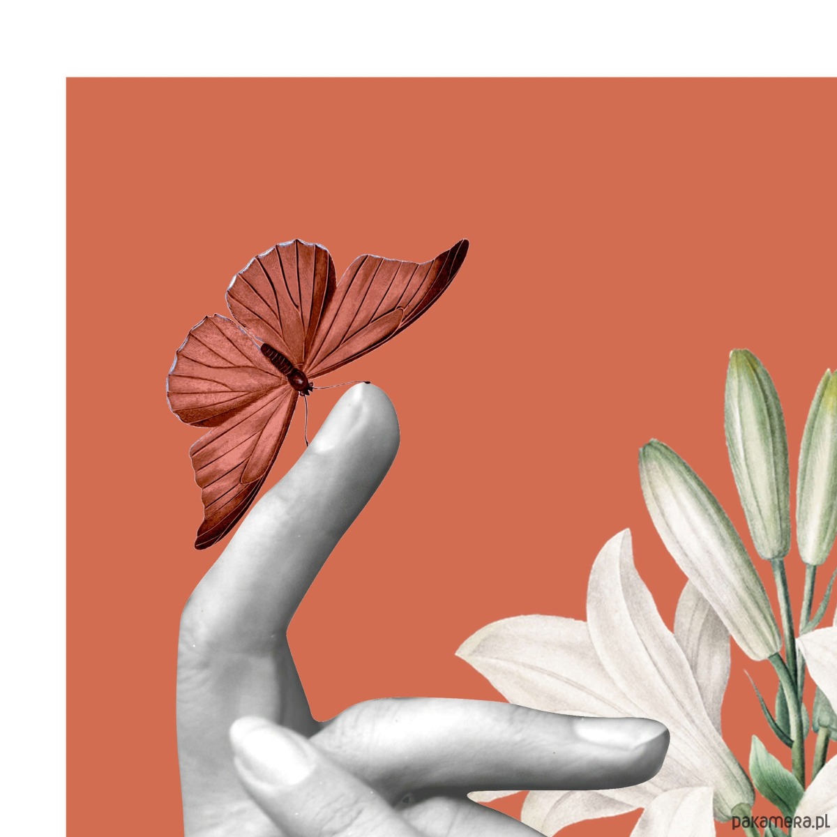 A na szczycie palca motyl, lekki, kruchy, niemal nieuchwytny, wtapia się w terakotowe tło.
