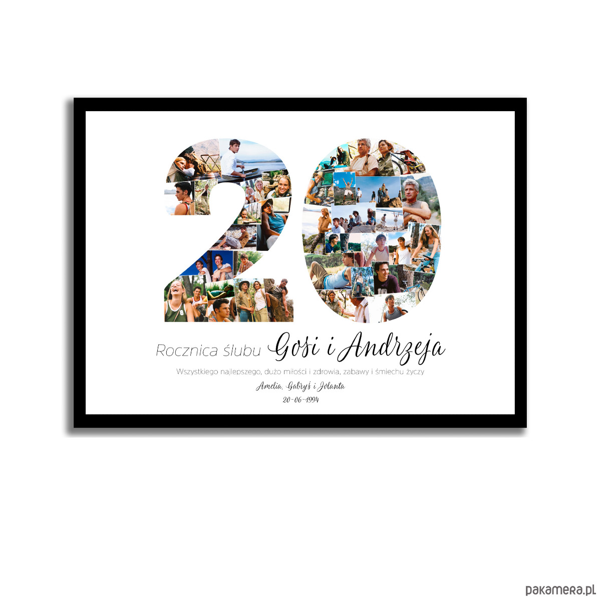 Piękny kolaż ze zdjęciami na 20 rocznicę ślubu. Zdjęcia bliskich, ważnych wydarzeń, z podróży, ze ślubu pięknie uchwycone w kolażu, pozwolą zapamiętać je na zawsze, pięknie ozdabiając ścianę domu.