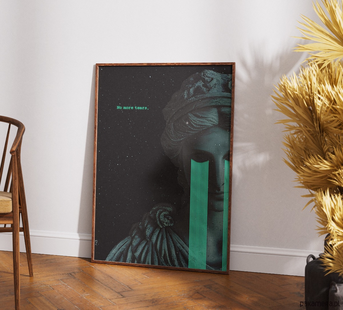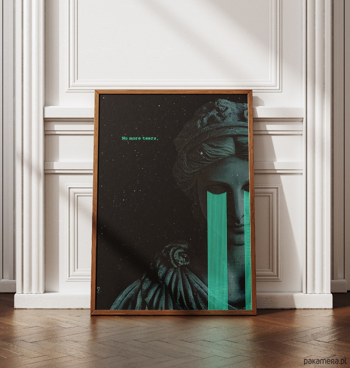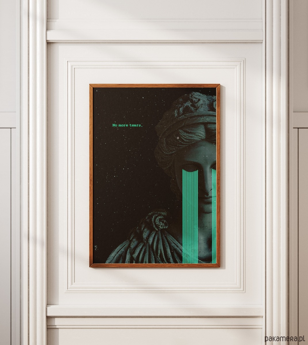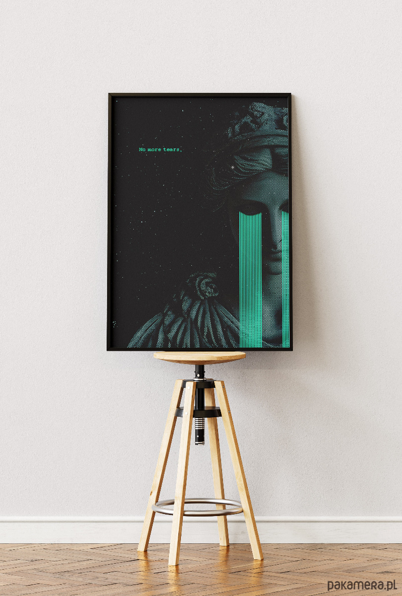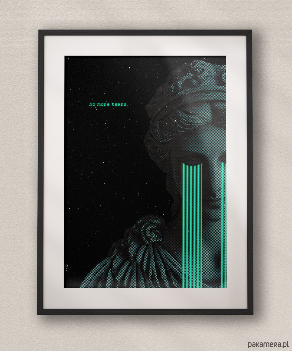 Plakat, który łączy antyczną harmonię z surowym, cyfrowym niepokojem. Połączenie klasycznej rzeźby, rastrowej tekstury i jaskrawych, "kodowych" łez tworzy intrygującą opowieść o emocjach w świecie technologii. To wizualna manifestacja odcięcia od bólu, zamknięta w chłodnej, kosmicznej estetyce.