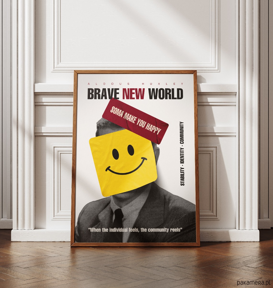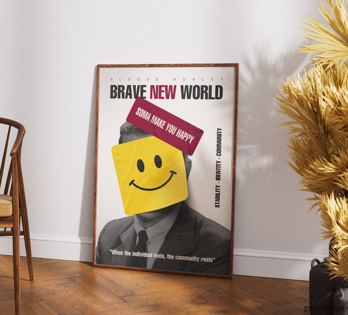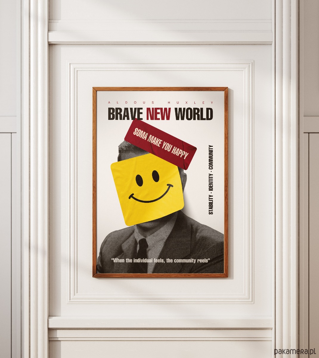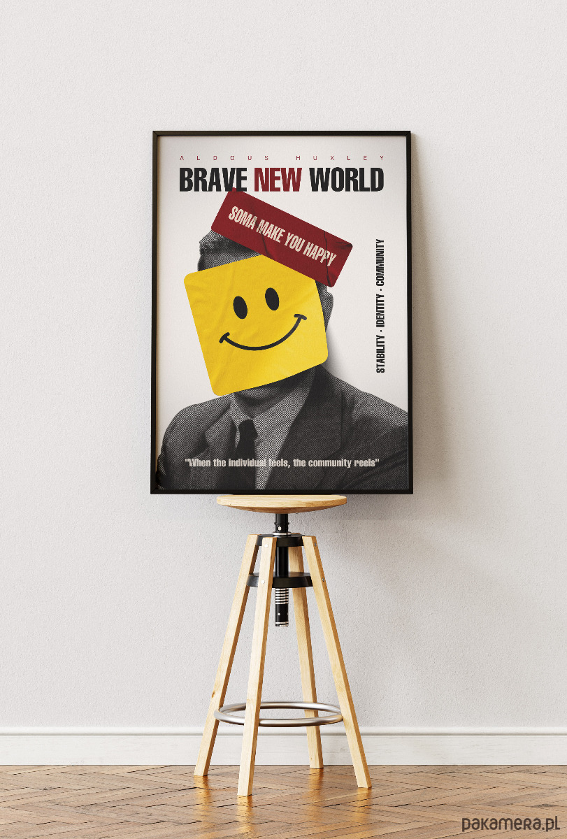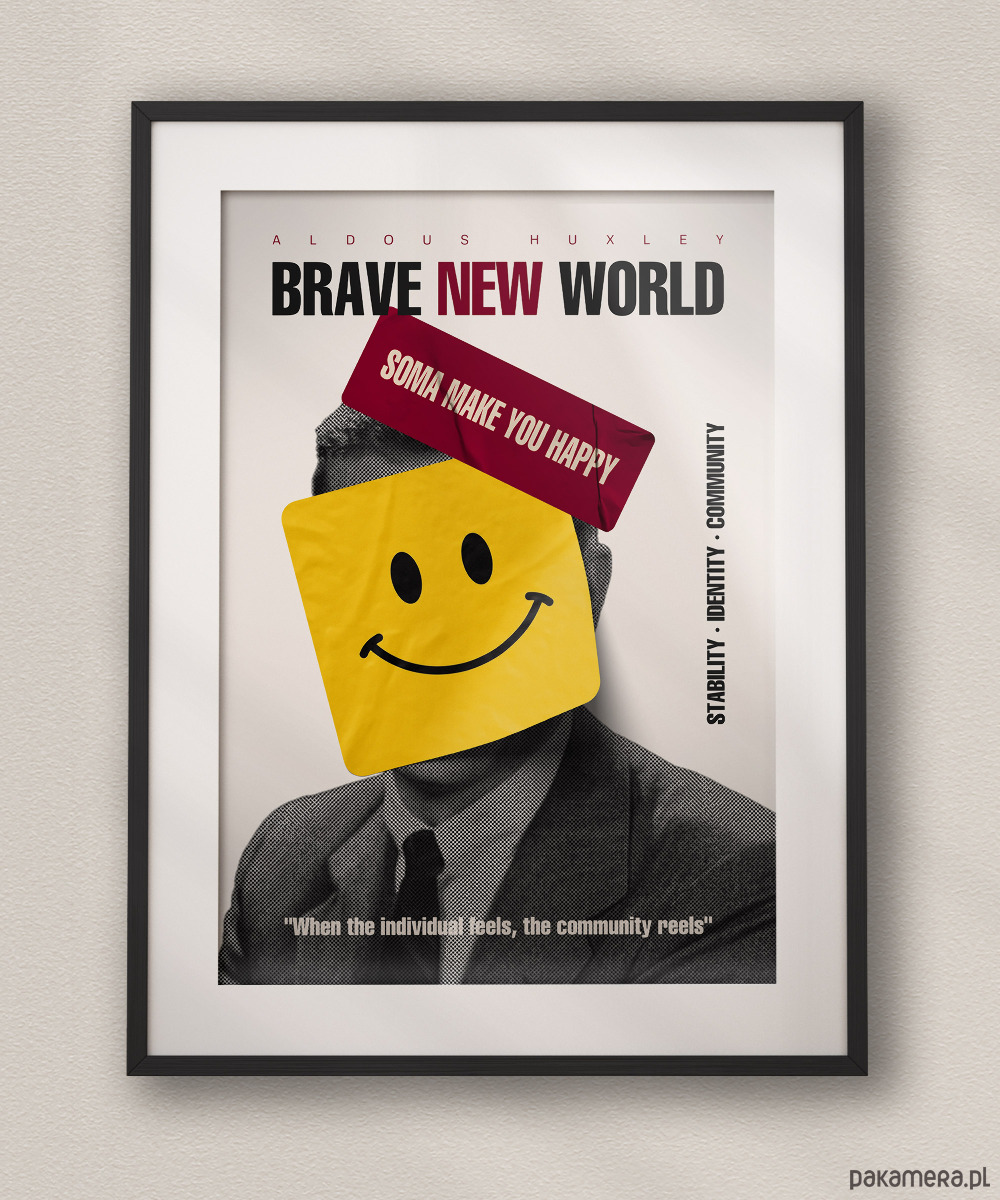Brutalnie szczery komentarz do współczesnej pogoni za sztucznym dobrostanem. Plakat jest hołdem dla antyutopii Aldousa Huxleya, wykorzystującym surową, rastrową estetykę i jaskrawe, pop-artowe akcenty. Żółta naklejka z uśmiechem i hasła o „Somie” zakrywające twarz postaci to mocna metafora systemowego tłumienia emocji w imię stabilności. Całość dopełnia kultowy cytat, który przypomina o wysokiej cenie, jaką płacimy za społeczną konformizację.