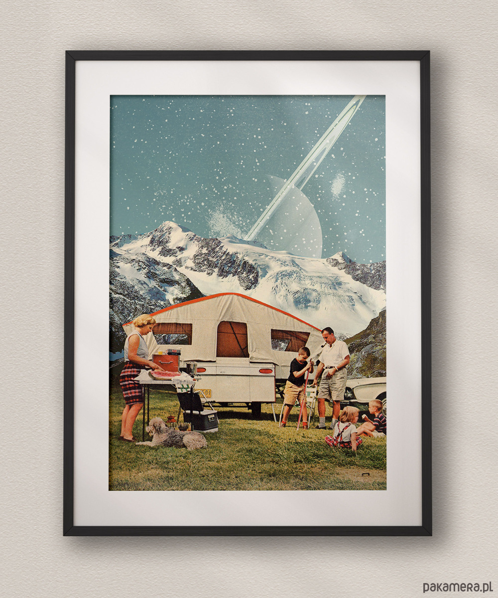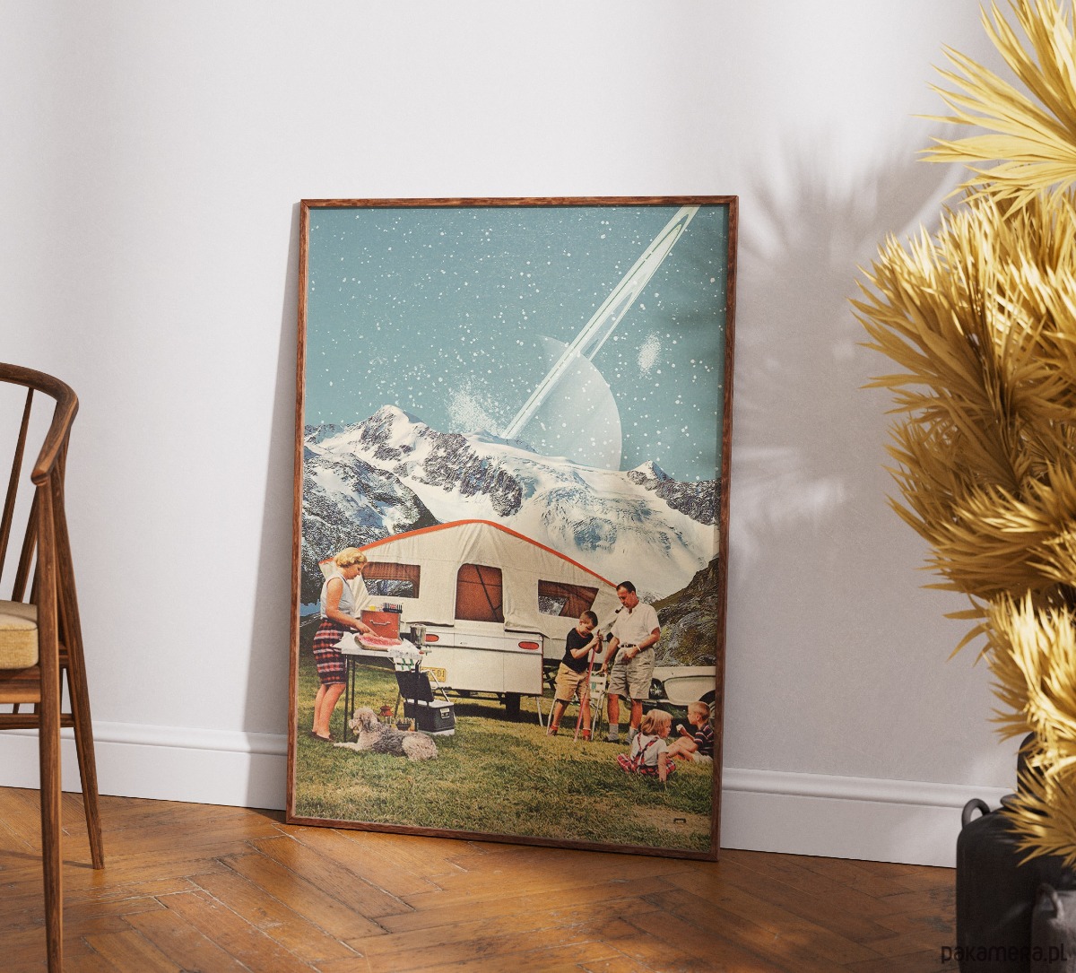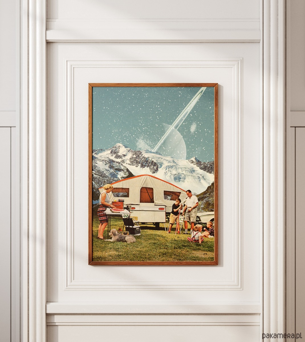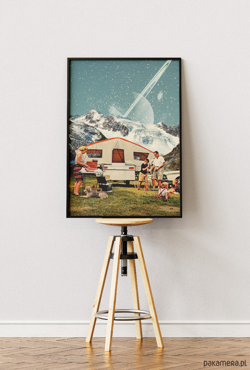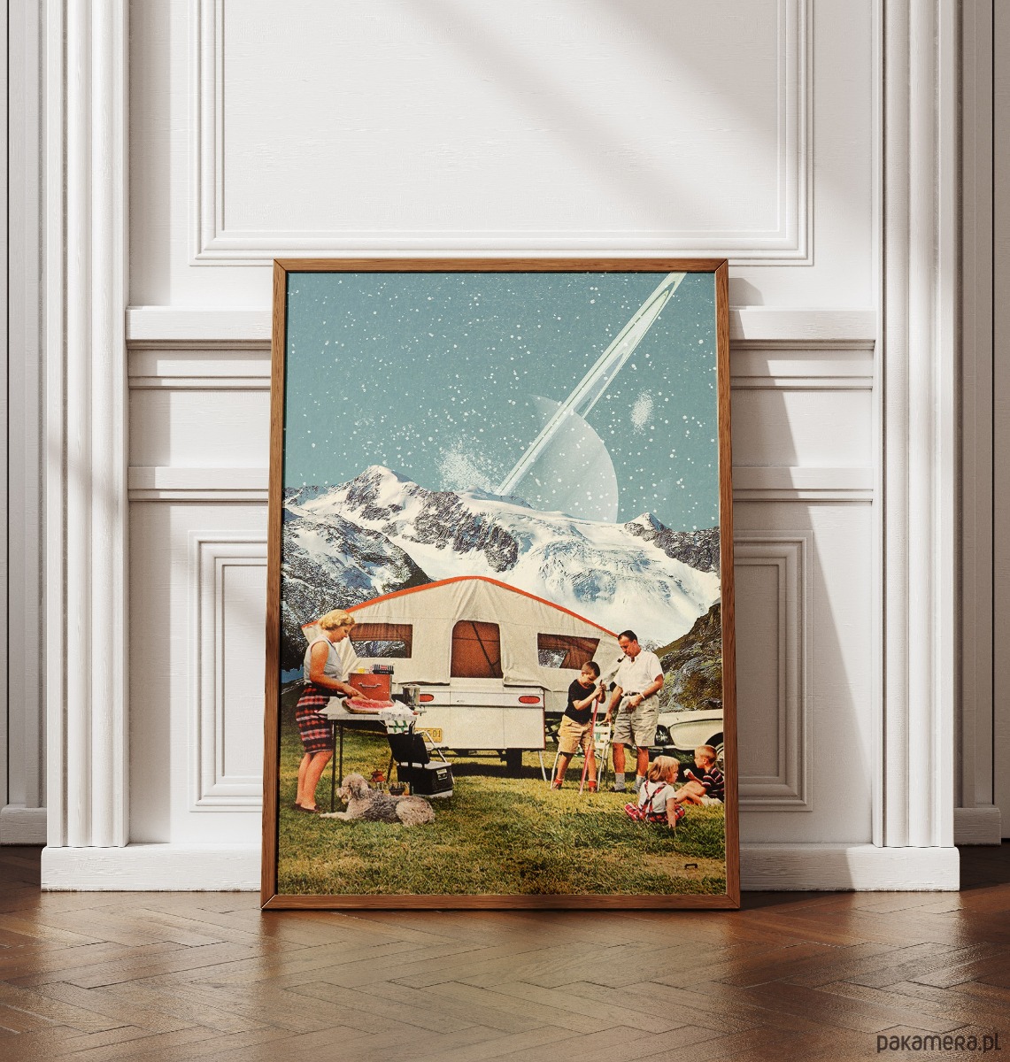 Pocztówka z alternatywnej rzeczywistości, w której granica między wakacyjną sielanką a bezkresem wszechświata ulega zatarciu. Plakat przedstawia klasyczną scenę kempingową – rodzinę przy przyczepie na tle monumentalnych Alp – nad którą góruje olbrzymi Saturn. Ta surrealistyczna kompozycja łączy ziemskie, prozaiczne czynności z majestatem kosmosu, sugerując, że największe przygody dzieją się na styku naszej codzienności i wyobraźni.