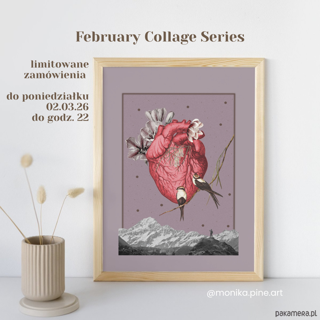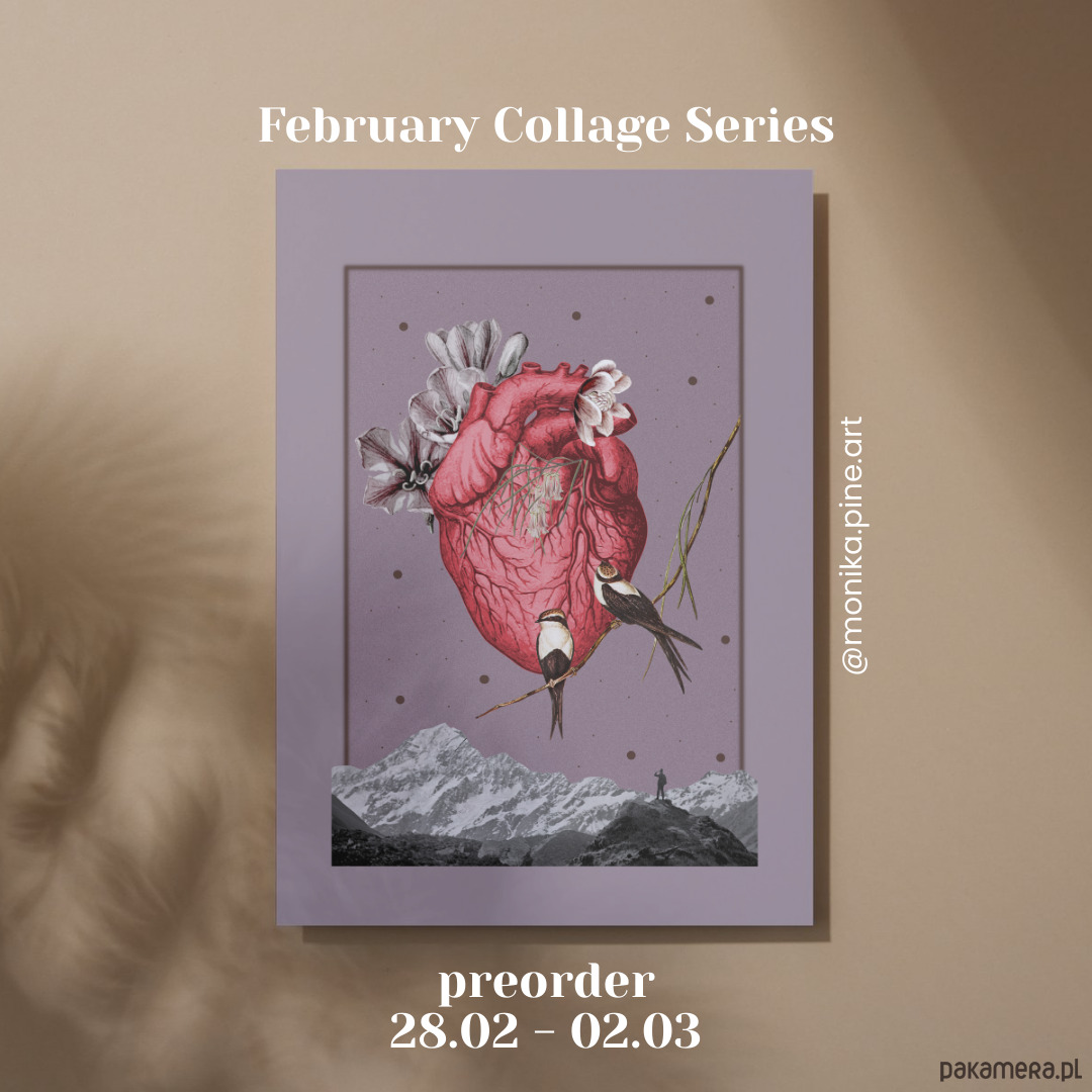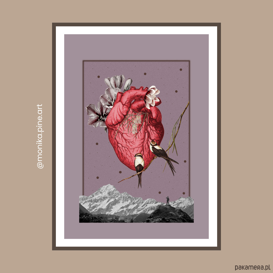 Kolaż oszczędny kolorystycznie, niemal monochromatyczny, zanurzony w odcieniach brązów, różów i fioletów, przełamany czerwienią serca. Frywolne jaskółki i majestatyczne góry. I wędrowiec — widzisz go? Jest malutki, ale bez niego nic nie miałoby sensu.